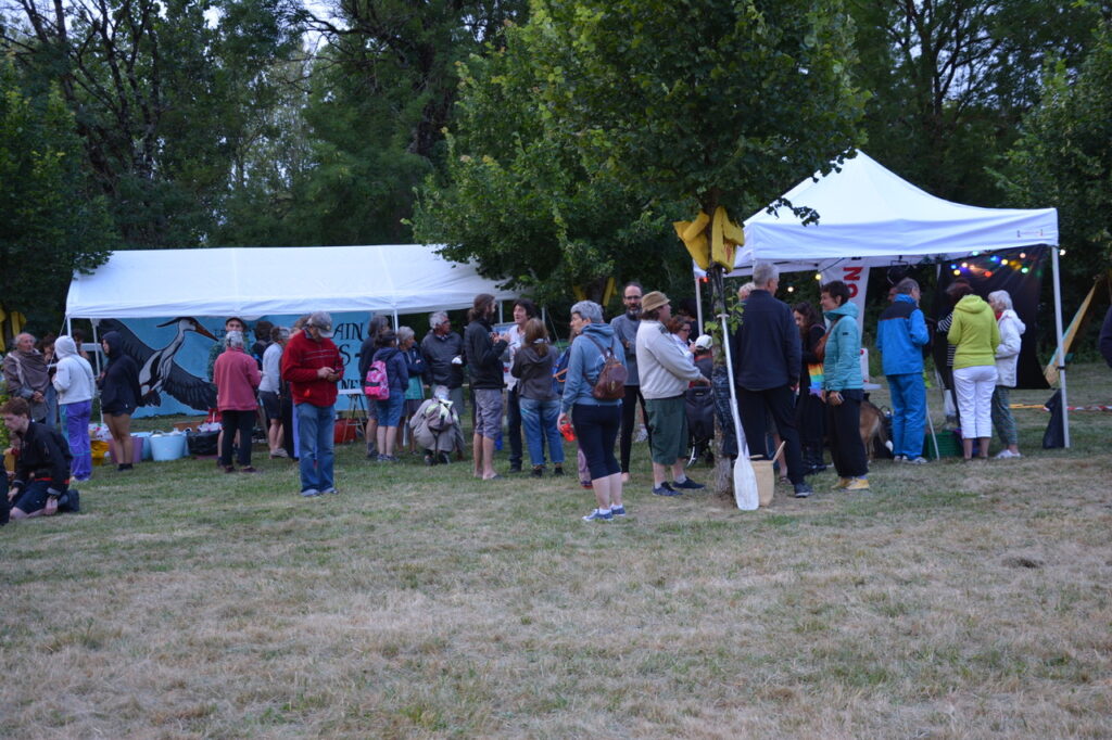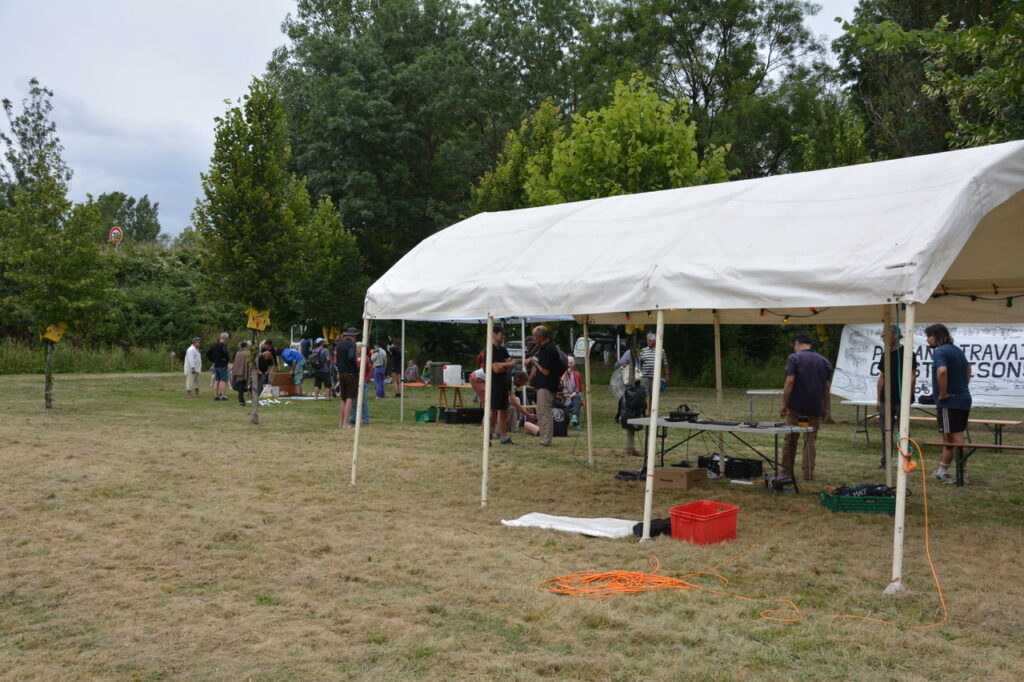 Après l’arrivée à Iteuil à proximité du Clain, sur le site de « La grève » , un bivouac s’est installé pour accueillir vélos, bateaux et visiteurs.teuses pour plusieurs temps d’échanges. D’abord, l’intervention d’Hugo de l’Atelier Paysan, coopérative d’autoconstruction : « Organisme de développement agricole et rural, nous œuvrons à la généralisation d’une agroécologie paysanne, pour un changement de modèle agricole et alimentaire radical et nécessaire » . Leur ouvrage de référence « Reprendre la terre aux machines : Manifeste pour une autonomie paysanne et alimentaire ! » était présenté par l’intervenant. Il a trouvé les mots pour captiver le public présent et un enregistrement audio vous sera rapidement proposé.