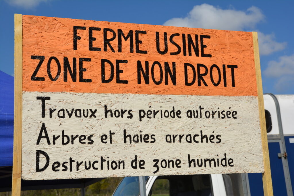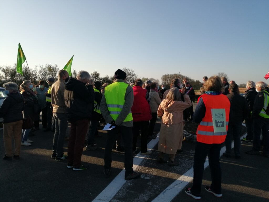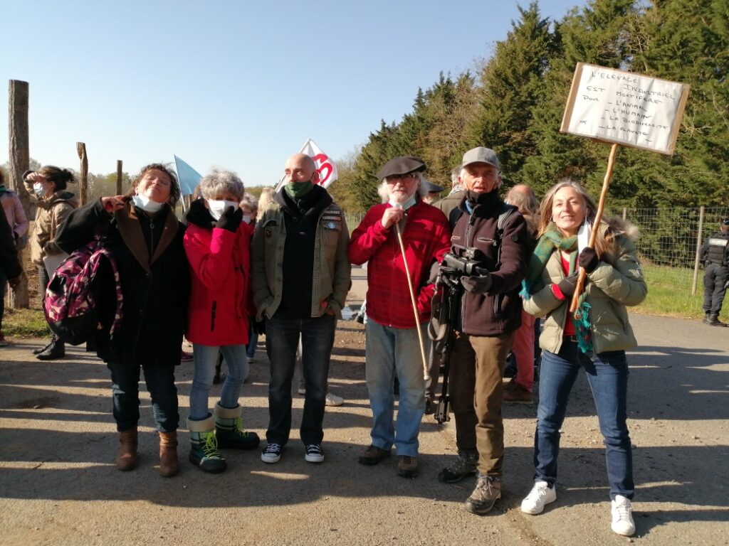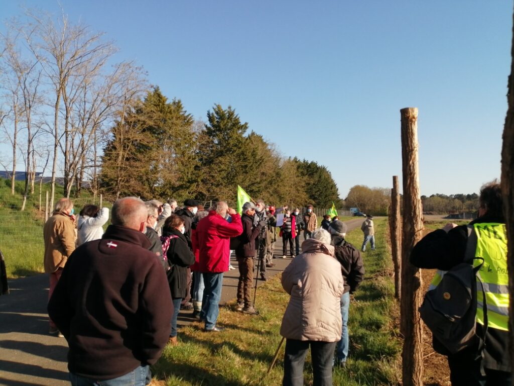 Aucun signe de travaux ce matin, notre présence aurait dissuadé les abatteurs d’arbres, chantier interdit en cette saison sur cette zone humide à protéger. Nous sommes allé.es sur le site qui doit accueillir la ferme-usine, les panneaux solaires et l’unité de méthanisation, une haie a été arrachée, un balisage de parcelle entamé sur ce terrain à proximité d’une nappe phréatique qui alimente la région en eau potable. Le Tribunal Administratif de Poitiers, le Conseil d’Etat ont été saisis pour que ce projet ne voit pas le jour. En attendant leur décision, nous continuerons à veiller.