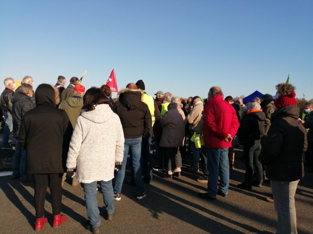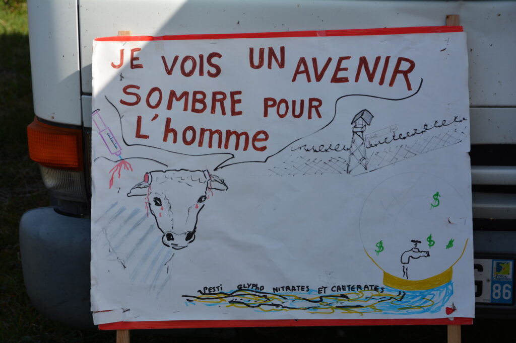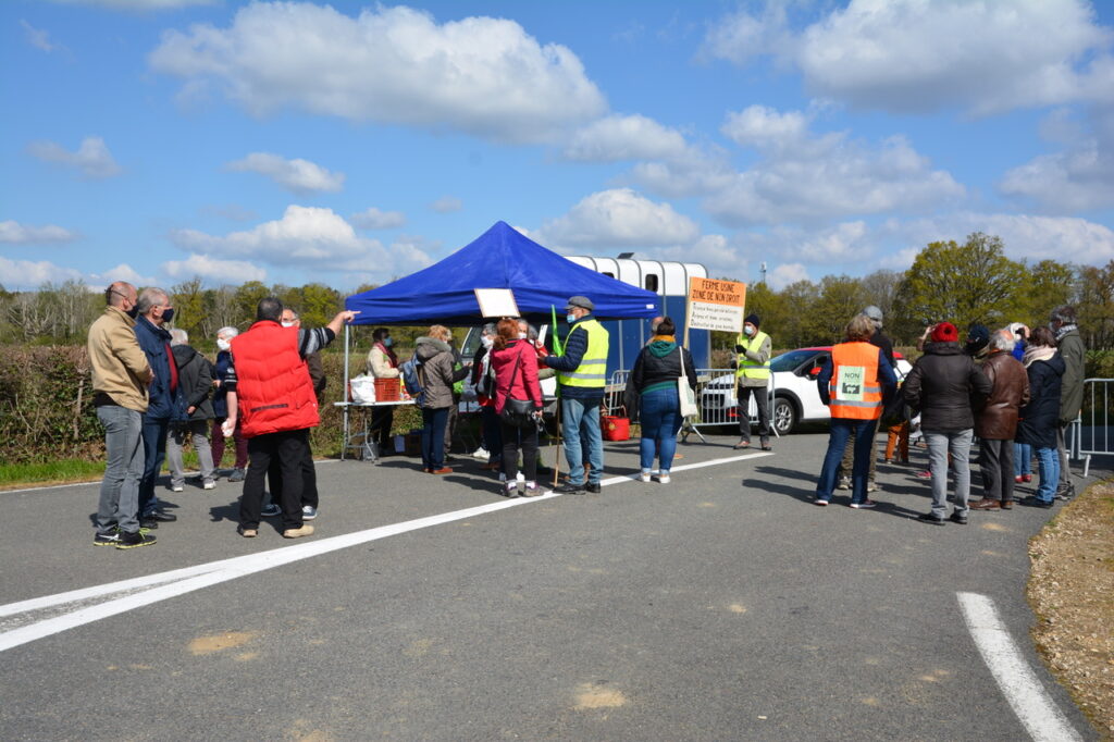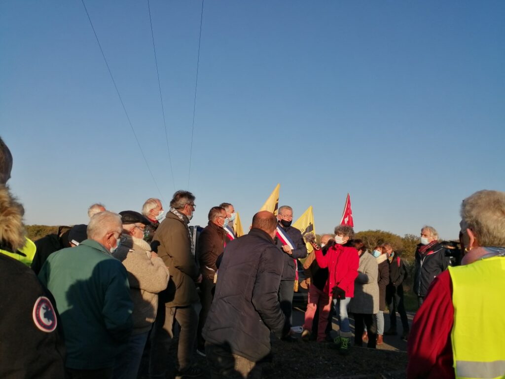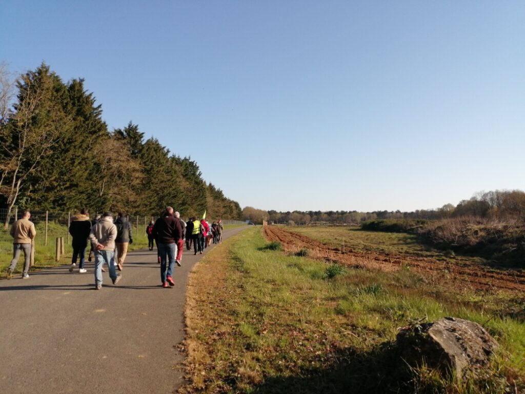 Aucun signe de travaux ce matin, notre présence aurait dissuadé les abatteurs d’arbres, chantier interdit en cette saison sur cette zone humide à protéger. Nous sommes allé.es sur le site qui doit accueillir la ferme-usine, les panneaux solaires et l’unité de méthanisation, une haie a été arrachée, un balisage de parcelle entamé sur ce terrain à proximité d’une nappe phréatique qui alimente la région en eau potable. Le Tribunal Administratif de Poitiers, le Conseil d’Etat ont été saisis pour que ce projet ne voit pas le jour. En attendant leur décision, nous continuerons à veiller.