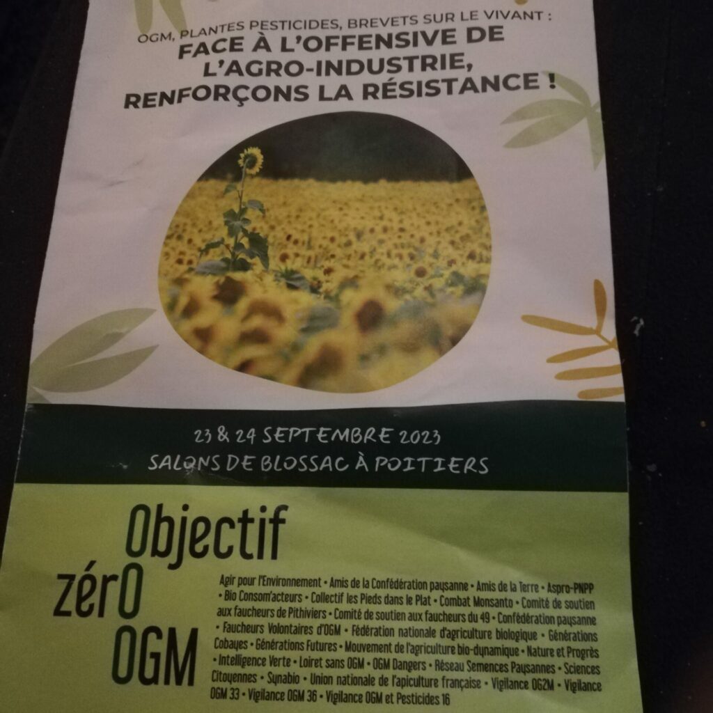 C’était les 23 et 24 septembre 2023 aux Salons de Blossac à Poitiers, conférences et tables rondes sur l’agro-industrie, les OGM, les pesticides et les bassines.