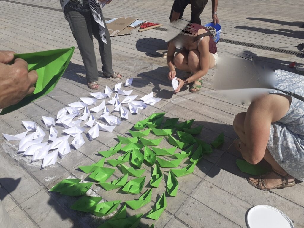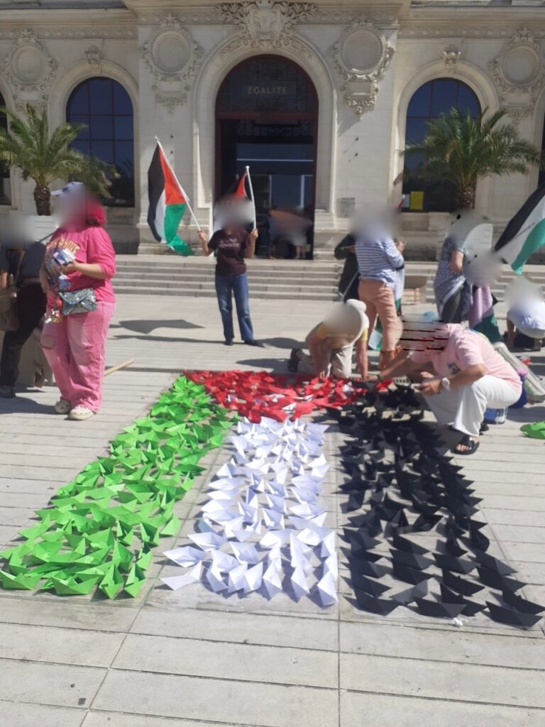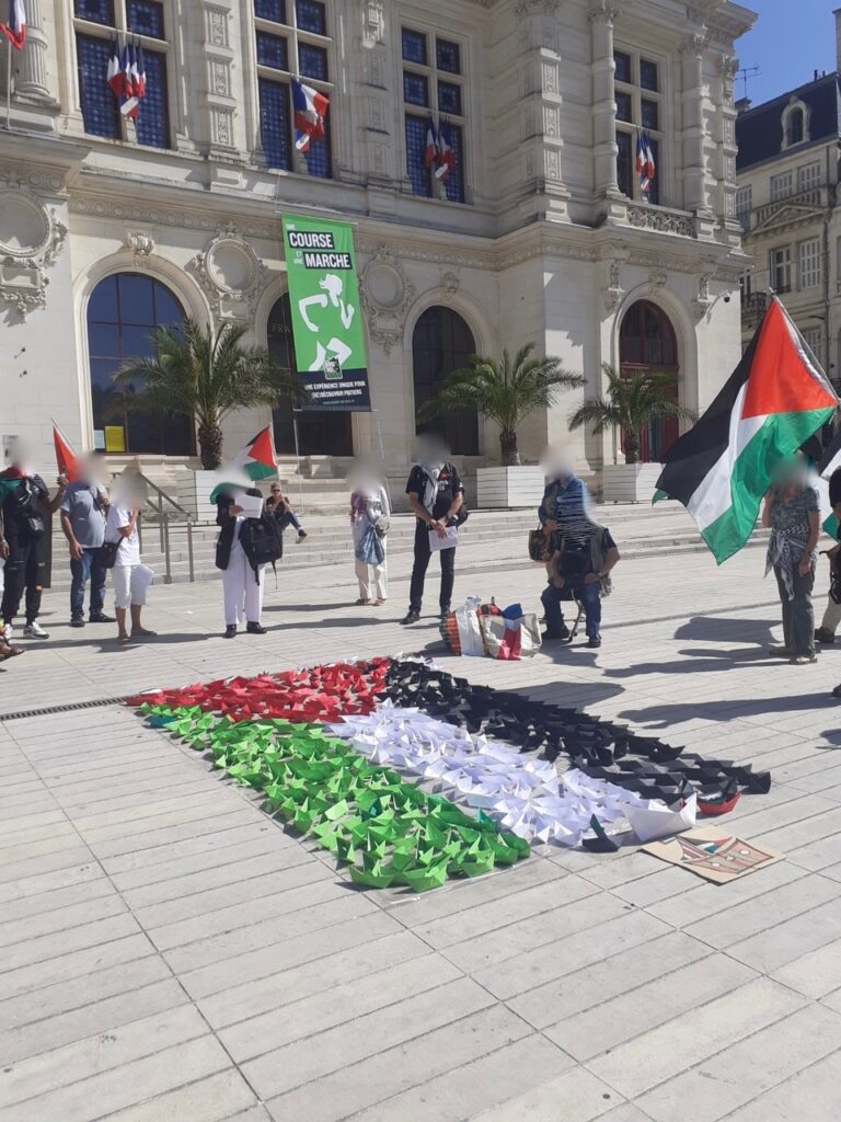 Samedi 6 septembre, sous un soleil de plomb, plus d’une centaine de personnes se sont retrouvées devant la mairie de Poitiers. Au sol, des dizaines de bateaux en papier, noir, blanc, vert et rouge aux couleurs du drapeau de la Palestine, en solidarité avec la flottille partie pour Gaza depuis quelques jours pour apporter matériel et nourriture à la population affamée par l’armée israélienne.