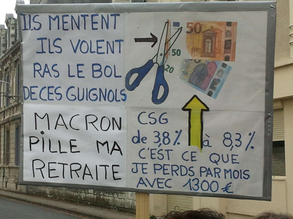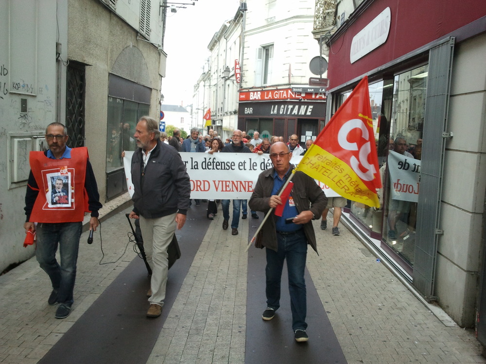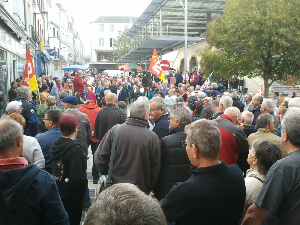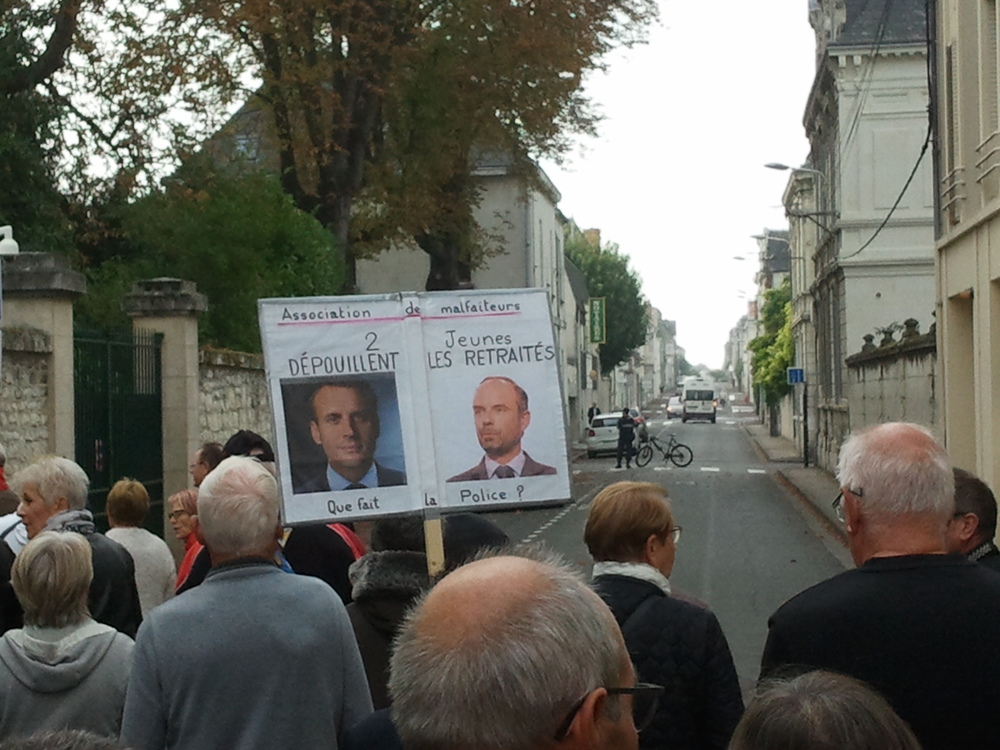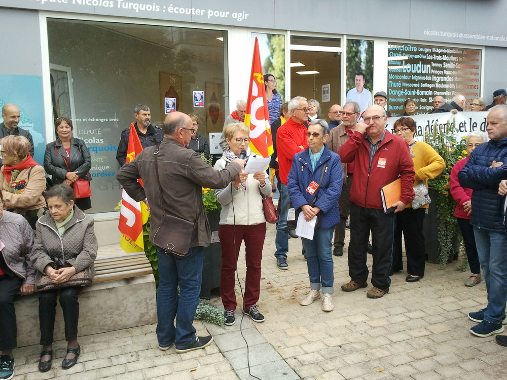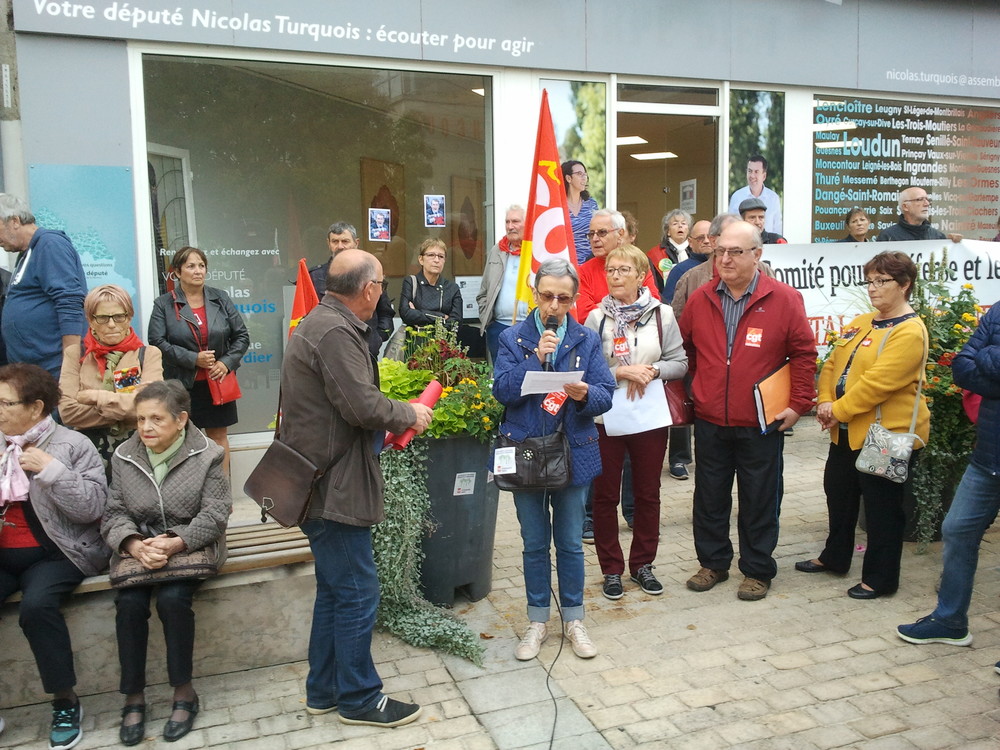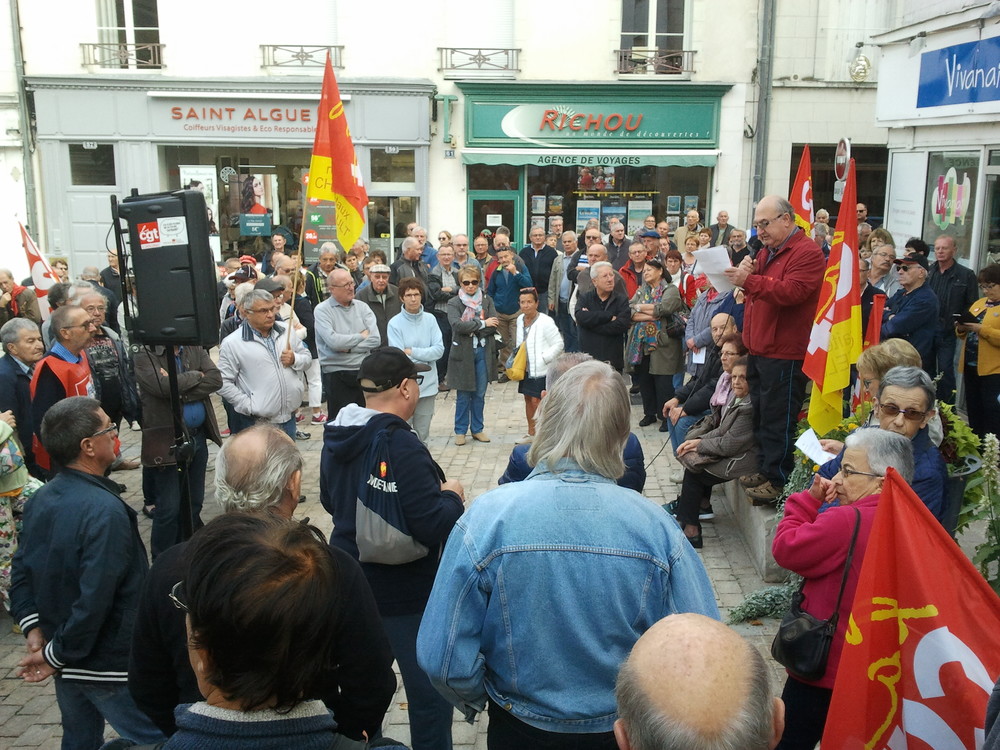 Manifestation des retraité.e.s à 10h00 place du marché à Châtellerault ce jeudi 18 octobre 2018 : 400 manifestant.e.s (visibilité CGT, ATTAC, DCGHNV, LO et FI) jusqu’à la sous-préfecture. La motion présentée par la CGT n’a pas pu être remise au député ni au sous-préfet qui a promis de recevoir une délégation dans les prochains jours.
