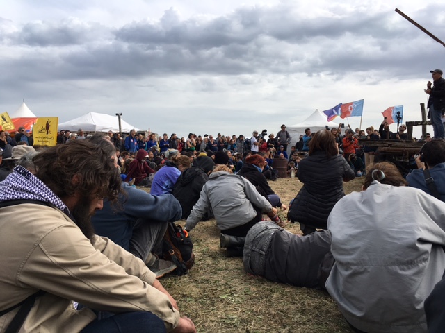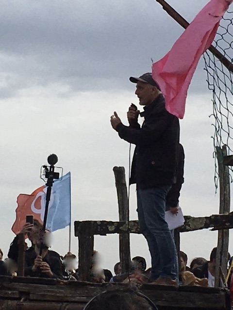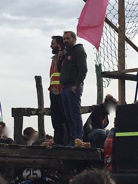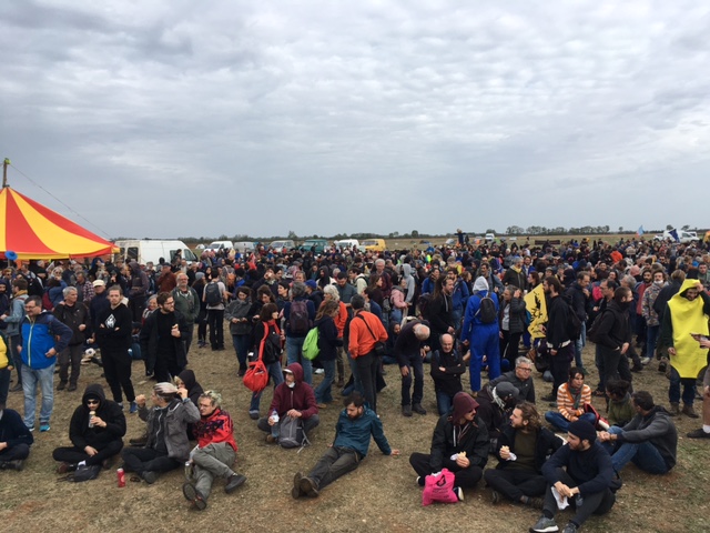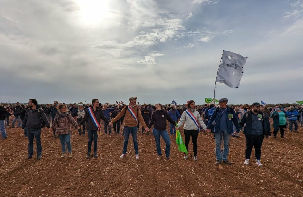 Contrôles d’identité et fouilles des véhicules à l’aller, marche pendant plusieurs kms avant d’arriver sur place, contrôle et relevé d’identités au retour : un déploiement de force qui a encore une fois fait renoncer nombre de personnes. Mais clairement, grâce à une organisation incroyable, le dispositif policier (plus de 1 700 GM, gendarmes,… ) a été dépassé par la foule (5 000 ? 6 000 ? 7 000 ?) répartie en trois groupes, les rouges (!) les verts (!) et les blancs (!) : trois cortèges simultanés qui ont élargi le front des manifestant.es. Le groupe vert a fait diversion par les champs de l’ouest, le groupe blanc est allé directement dans la direction de la bassine et a été le premier à franchir le mur des CRS. Le groupe rouge plus à l’est est arrivé le premier dans la bassine même puis est ressorti. Tous les champs sur 180 degrés étaient occupés. En raison du vent, les lacrimo ont souvent été dispersés vers les « forces de l’ordre » qui ont aussi beaucoup couru. Avec leur équipement, ça ne facilite pas les choses. Des blessé.es aussi et bien plus chez les manifestant.es que les « bilans officiels » ne l’avancent pour les FDO. Il faut bien « gonfler les chiffres » pour justifier le déploiement policier. La presse serait bien inspirée d’interroger Darmanin sur la réalité de ses chiffres…