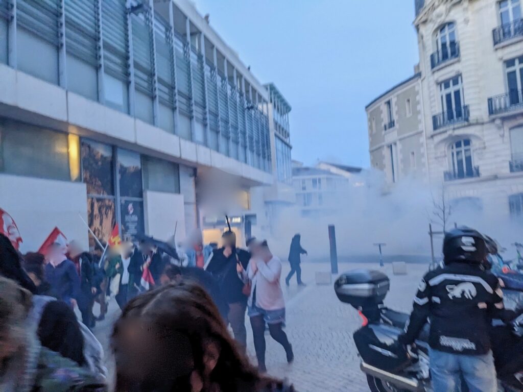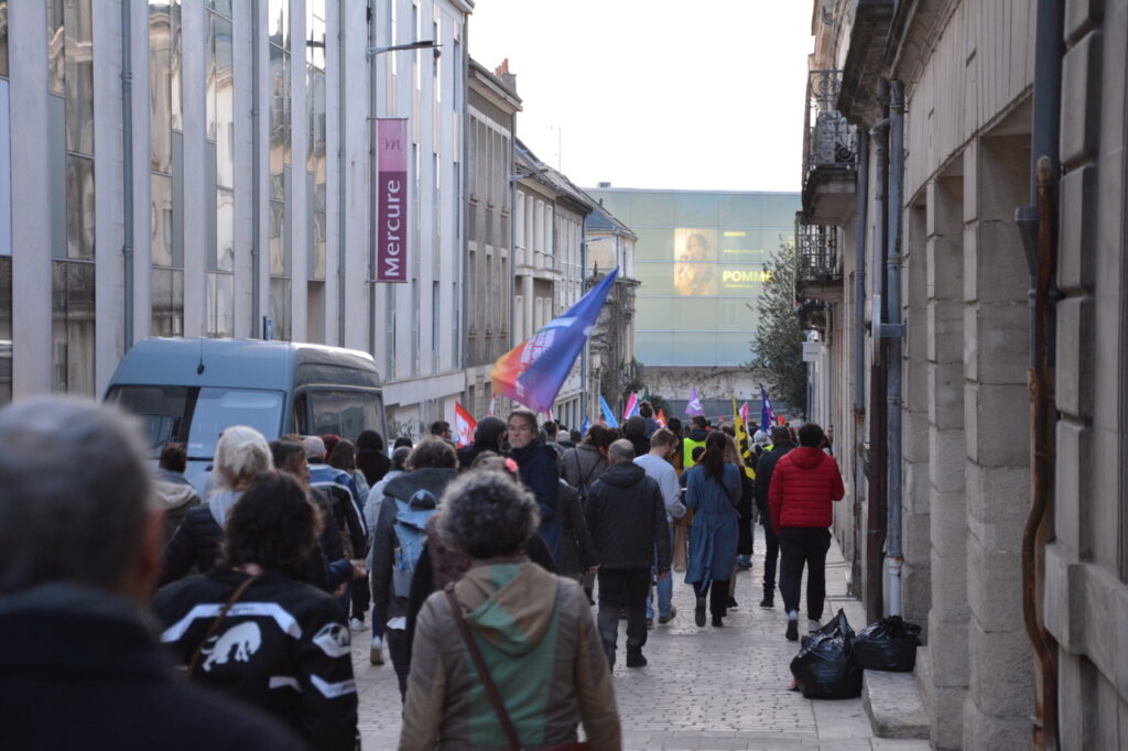 Manif dans le centre-ville avec des blocages policiers pour empêcher le cortège de descendre vers la gare, puis de partir vers la place du marché… Avec de l’énervement à la clé : police partout… et lacrymo autour des Cordeliers puis descente vers le pont St Cyprien et course sur le boulevard Anatole France…