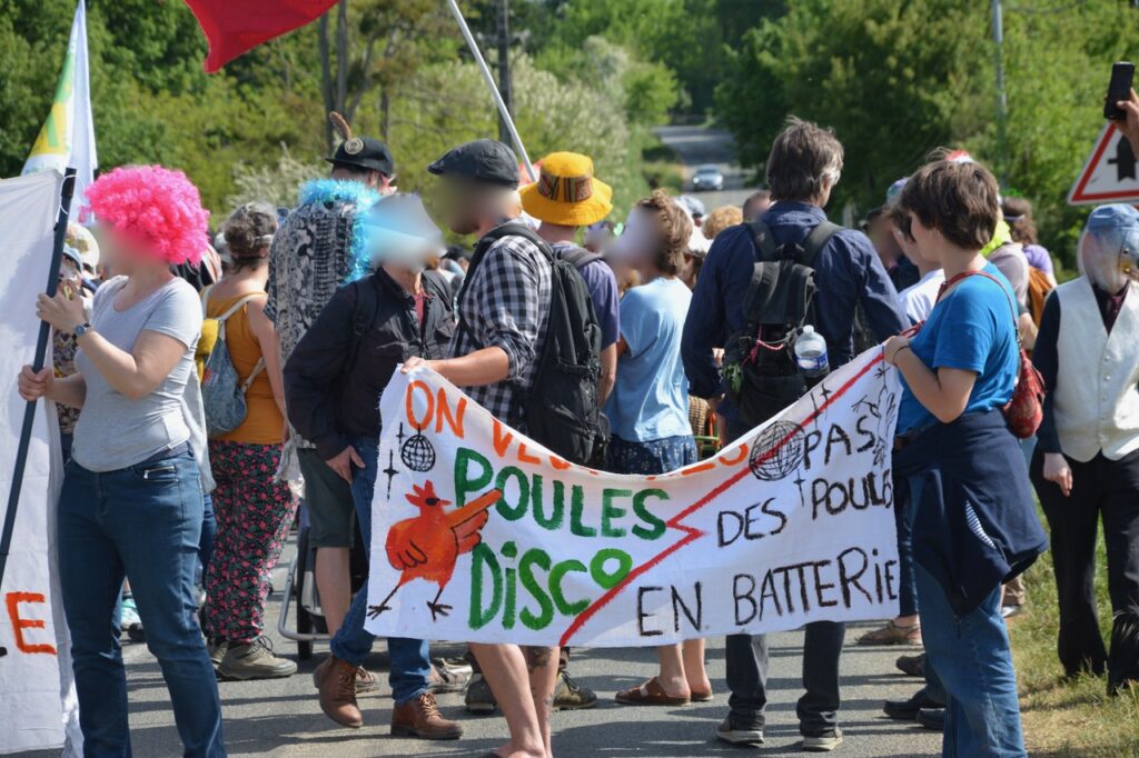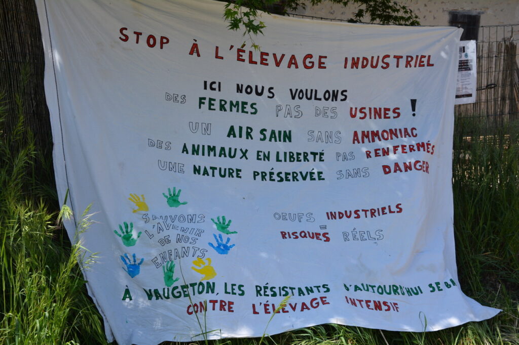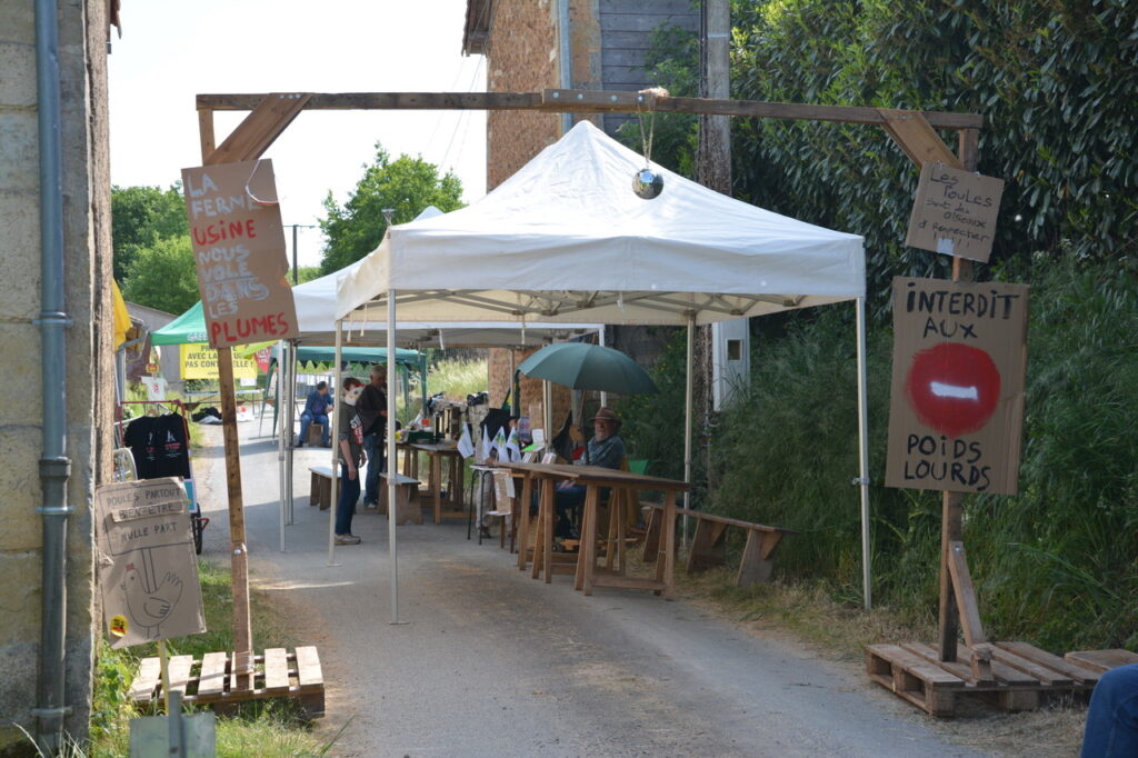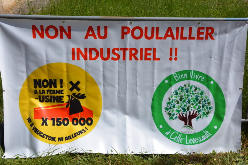 Samedi 25 avril, sous un soleil resplendissant, de 150 à 170 personnes se sont retrouvées dans le hameau de Vaugeton sur la commune de Celle l’Evescault. Un nouveau rassemblement suivi d’une manifestation pour dénoncer les travaux en cours qui prévoient l’installation d’une usine à poules pondeuses (de 140 000 à 150 000 !) à proximité des habitations. Rien n’y fait : ni les arrêtés municipaux, ni les actions menées en justice : le projet continue avec la bénédiction du préfet de la Vienne. Illégalité des travaux de voirie, de la traversée du hameau par les camions de chantier, absence de permis de construire : quand il s’agit de satisfaire les industriels de l’œuf, la voie est libre !