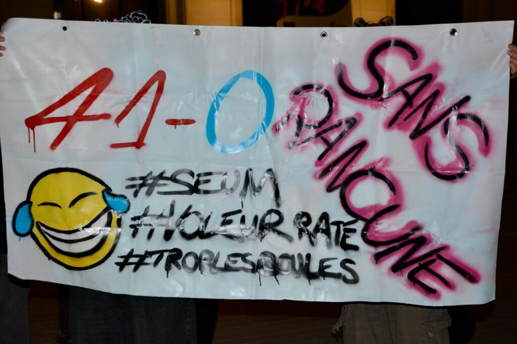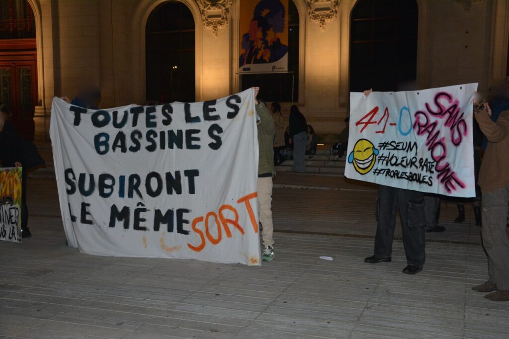 Quelques jeunes agri-tracteurs ont bien tenté de s’approcher des manifestant.es réuni.es devant la mairie, du genre « retenez-moi où je fais un malheur » mais le cordon policier et la volonté des manifestant-es de conserver le caractère festif et pacifique de la victoire contre les 41 bassines ont permis que la situation ne dégénère pas, au grand dam des parangons de virilité.