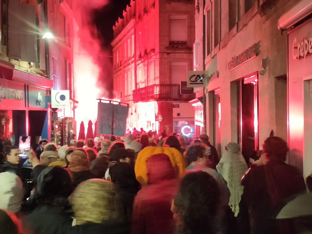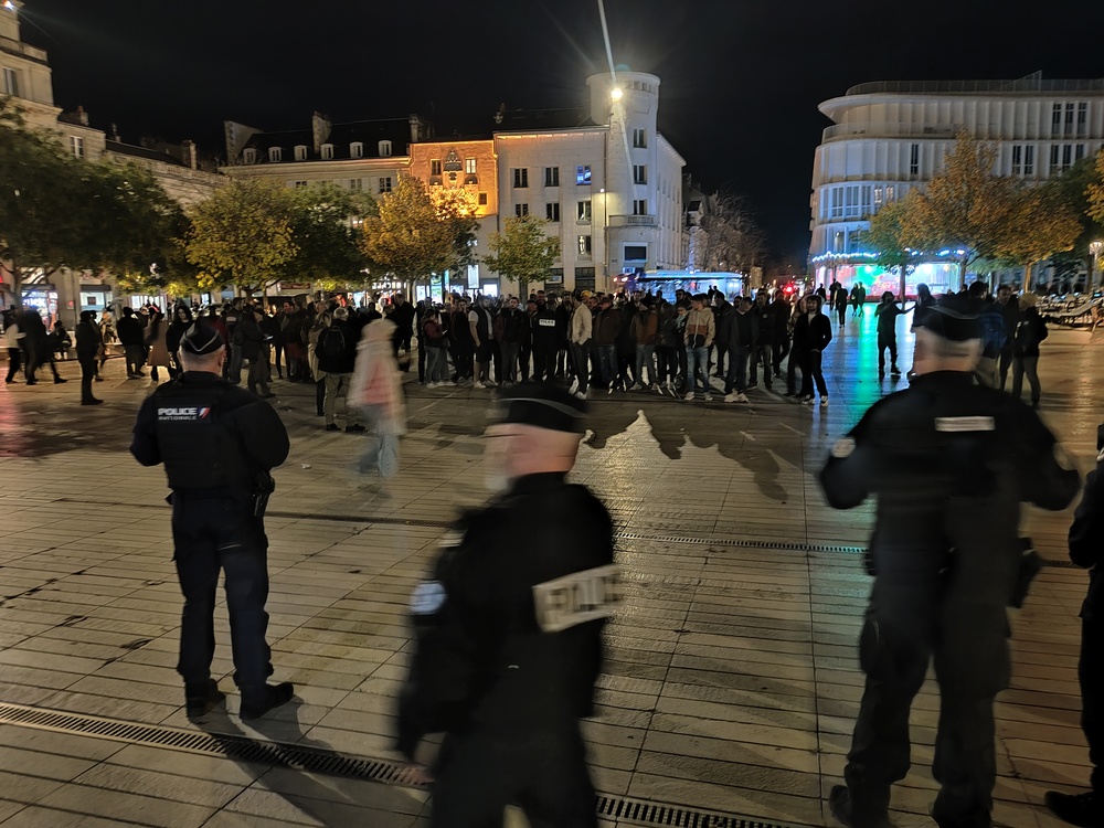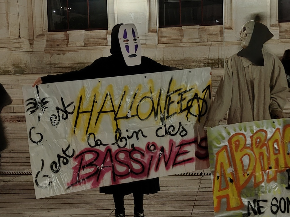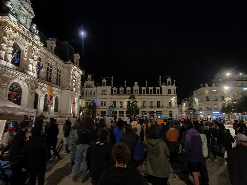 Forcément, sans tracteur, on impressionne moins et à 70, ça se voit moins sur la place de la mairie de Poitiers. C’est le nombre que les syndicats agricoles « majoritaires » ont réussi à réunir dans un coin de la place près des cinémas lors de cette soirée « Halloweenienne » poitevine. Le tout sous l’œil attentif d’une vingtaine de policiers en uniforme ou en civil (non loin étaient positionnés de très nombreux CRS) qui ont rapidement convergé vers les manifestant.es pour faire une sorte de « tampon » , au cas où…