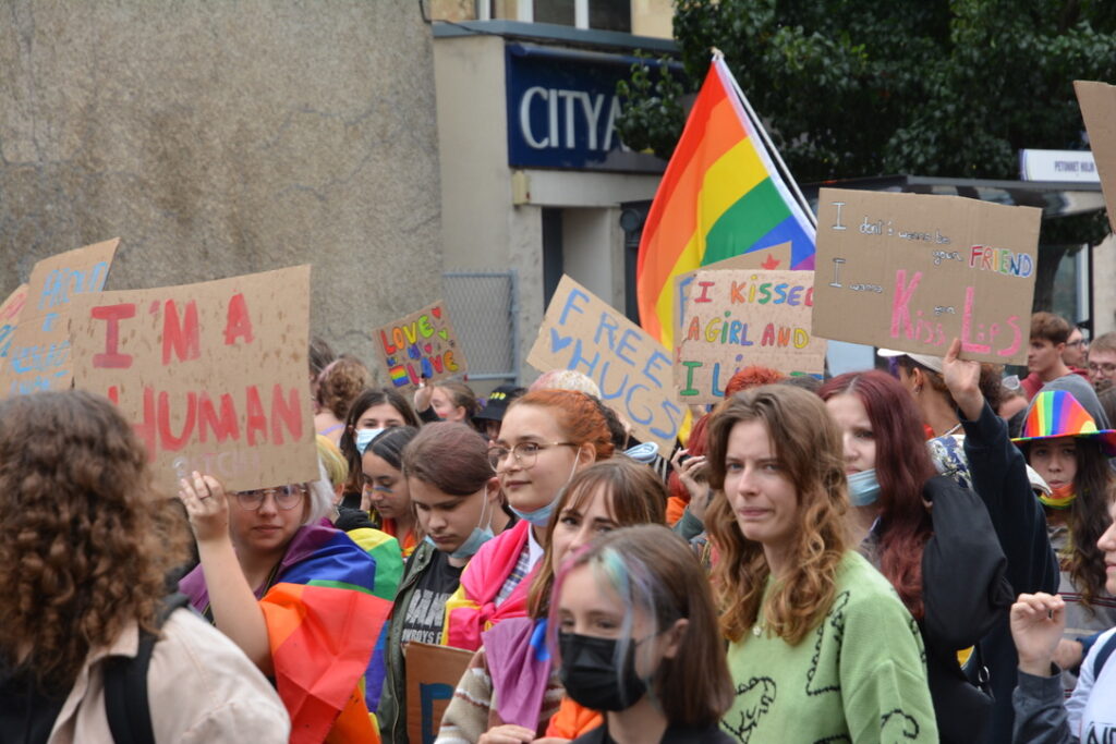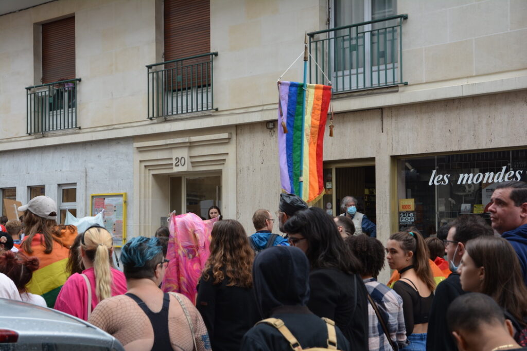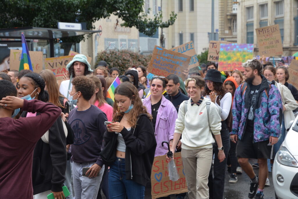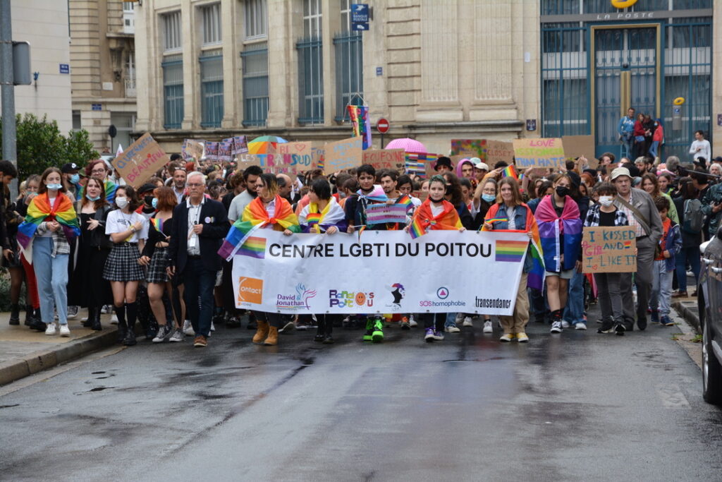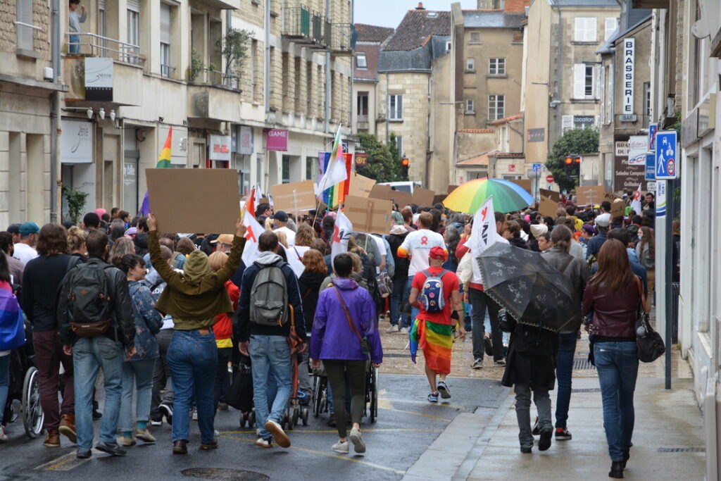 De la place du marché à la place de l’hôtel de ville, il n’y a guère plus de 500 m mais l’ambiance des deux manifestations organisées en parallèle ce samedi 18 septembre était bien différente. Depuis 13 h 30, les associations LGBTI+ avaient installé, face à la mairie leurs stands d’information. (Aides, Centre LGBTI du Poitou…) A 15 h, un cortège coloré et animé par des percussions et des slogans relayés par des porte-voix est parti vers la préfecture, passant ensuite devant la poste centrale avant de défiler par les rues piétonnes pour un retour au point de départ. Avec la météo du jour (ou une motivation défaillante ?), le cortège était bien moins fourni que l’année dernière avec environ 500 personnes mais l’ambiance était toujours aussi festive et le public jeune et revendicatif.