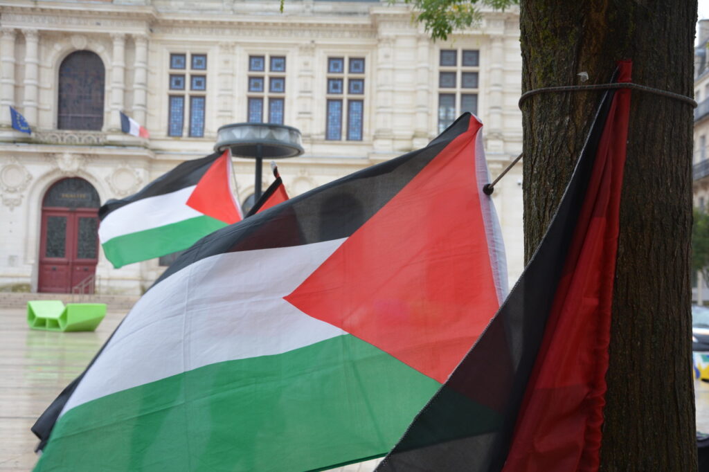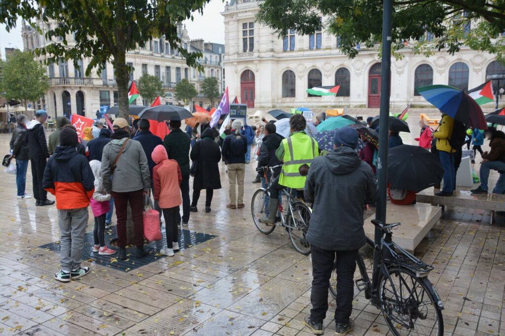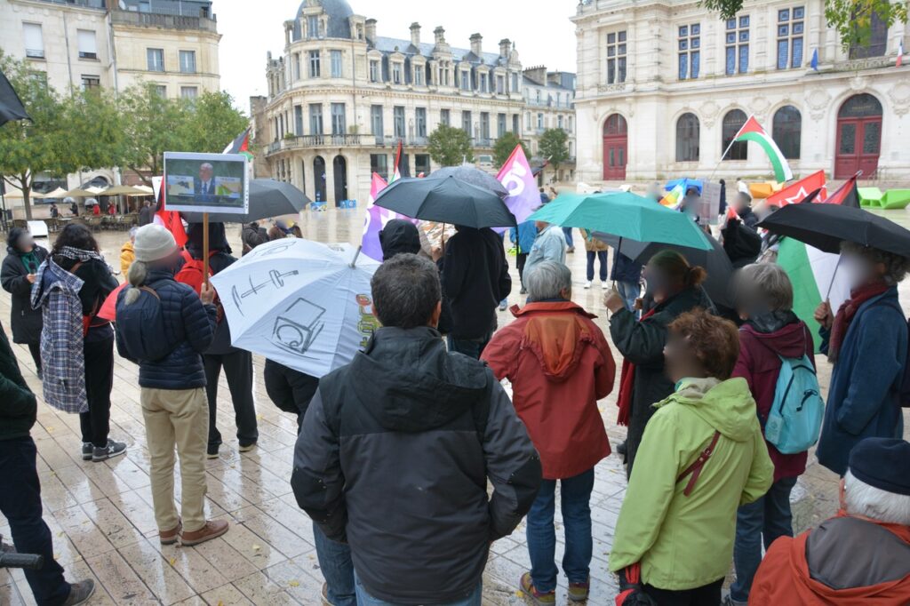 Ce samedi encore, bravant une météo maussade, entre 80 et 100 personnes se sont retrouvées une fois encore devant la mairie de Poitiers pour exprimer leur solidarité avec la Palestine, que ce soit à Gaza, en Cisjordanie occupée ou au Liban. Rien n’arrête Netanyahou, ni la réprobation internationale, ni les appels de l’ONU : mais comment pourrait-il en être autrement quand les soutiens d’Israël qui appellent à la retenue (!) ne sont pas capables de faire autre chose que de parler… dans le vide.