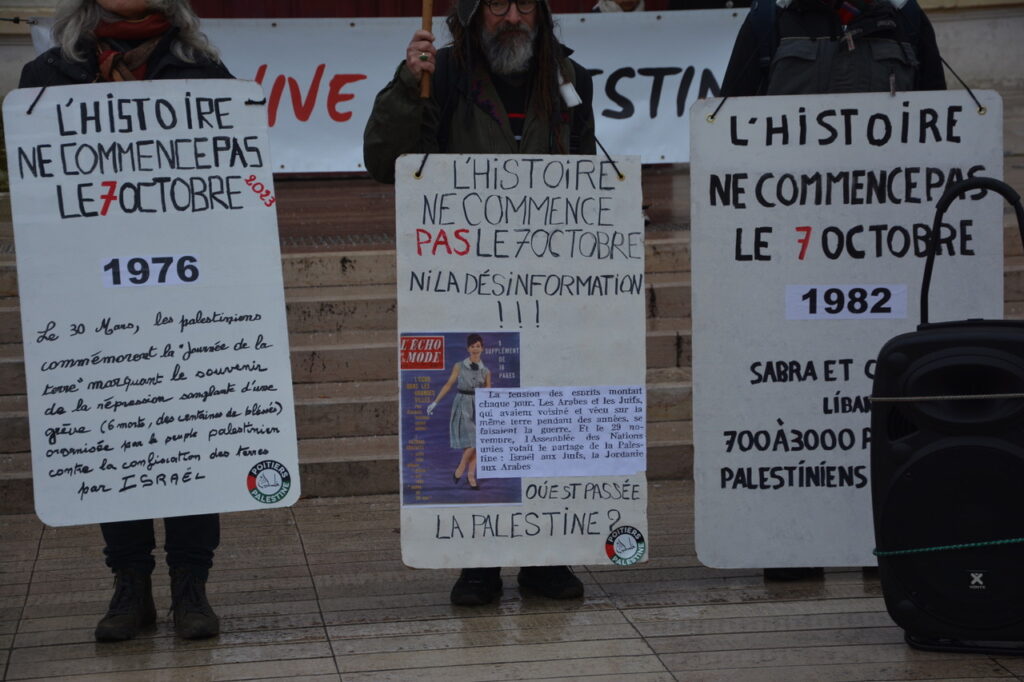 Comme vous pourrez le voir, de nombreux panneaux avaient été confectionnés pour replacer la situation actuelle dans le temps long de l’histoire de la Palestine et de la spoliation que le peuple palestinien subit depuis plus d’un siècle.