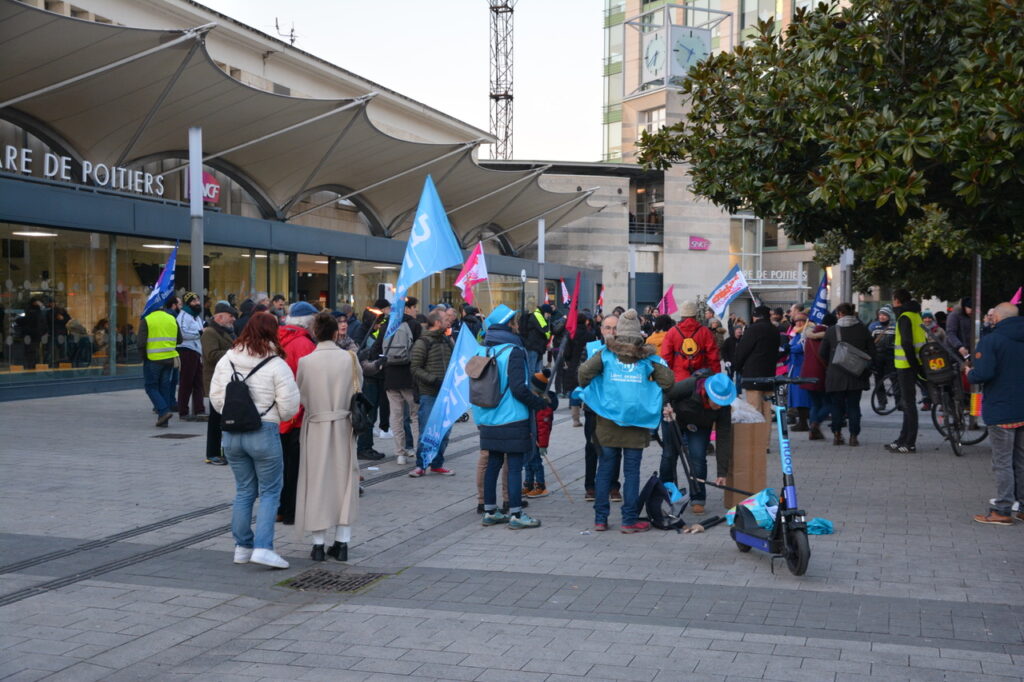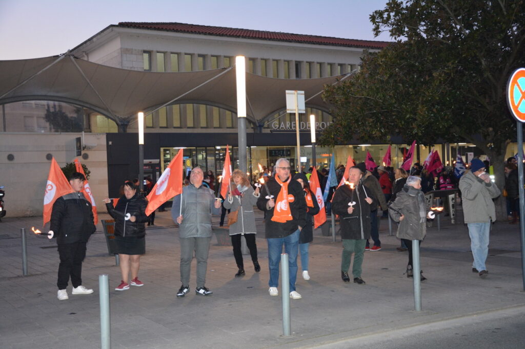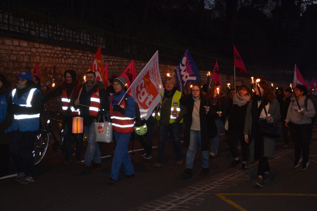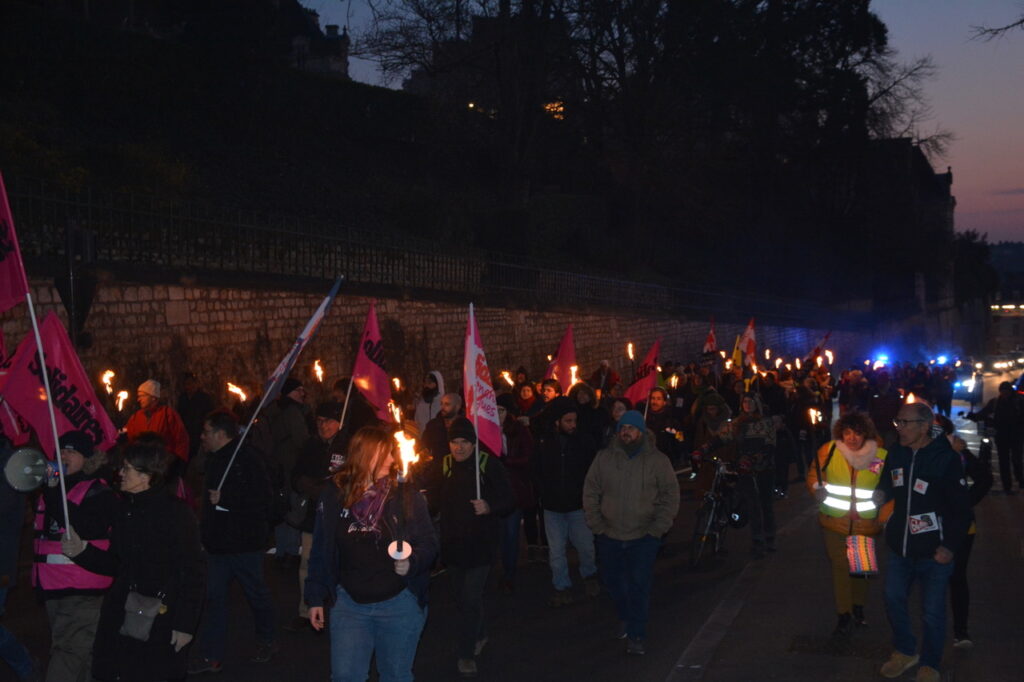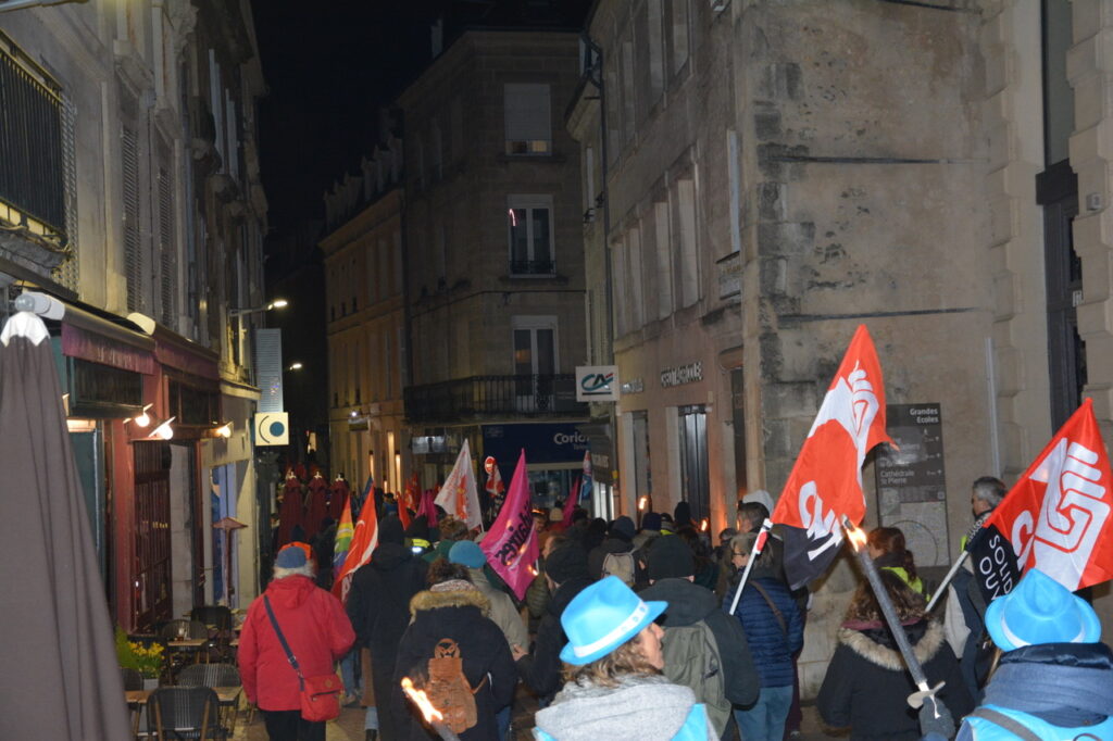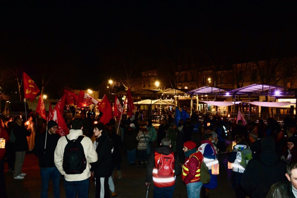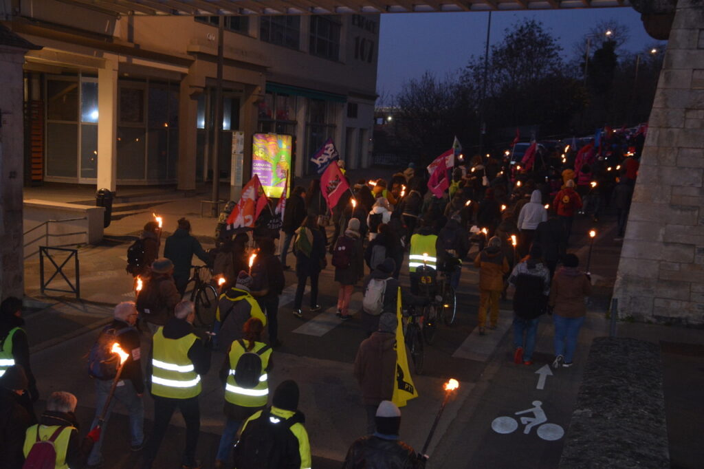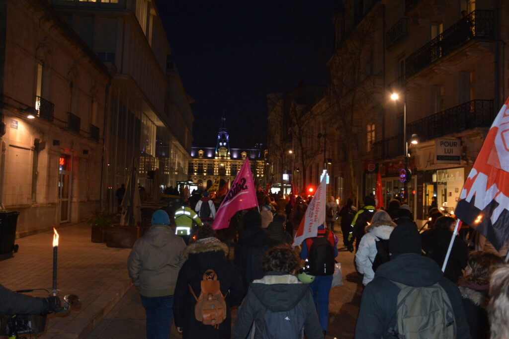Les flambeaux étaient de sortie devant la gare de Poitiers mercredi 1er mars : environ 250 personnes ont marché jusqu’à la place du marché dans un froid vif. Les flambeaux n’ont pas permis de se réchauffer mais auront tenté (sans succès sûrement) d’éclairer le gouvernement en plein brouillard face à l’opposition résolue de la population à la contre-réforme des retraites voulue par Macron.