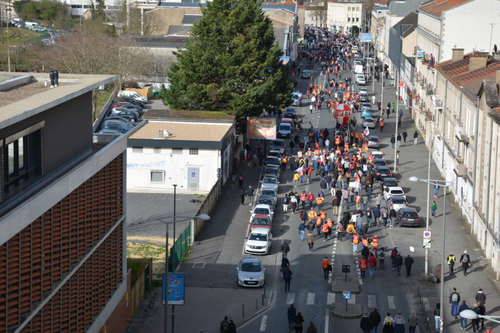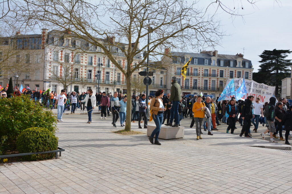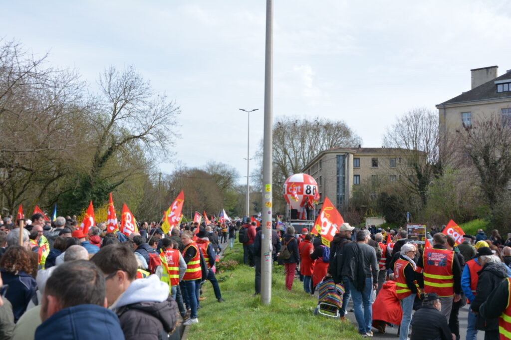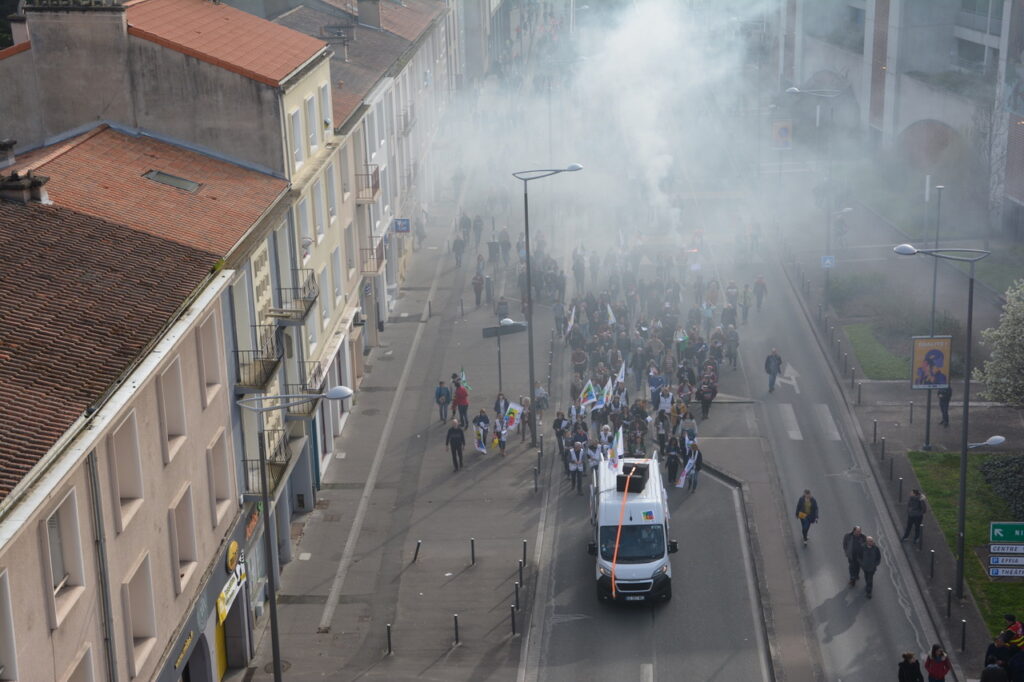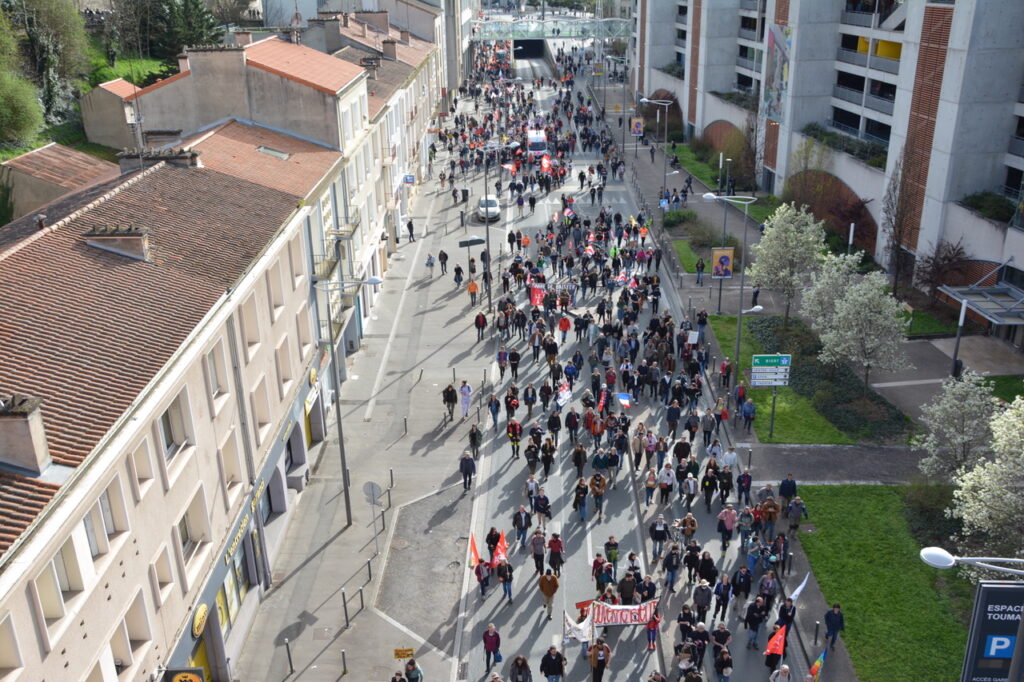 Long cortège et remontée dynamique de la rue Jean Jaurès, passage par la préfecture et un peu de nervosité du côté des FDO quand nous sommes passés devant… mais pas de difficultés particulières : comme quoi. A partir du viaduc L. Blum, la police nous a accompagné en prévision d’une action à la gare comme cela s’est passé un peu partout depuis quelques jours ? Retour à la Porte de Paris par le boulevard de la gare… on commence à connaître le trajet… Près de 500 personnes sont restées sur place un long moment… bien des choses à construire pour la suite…
