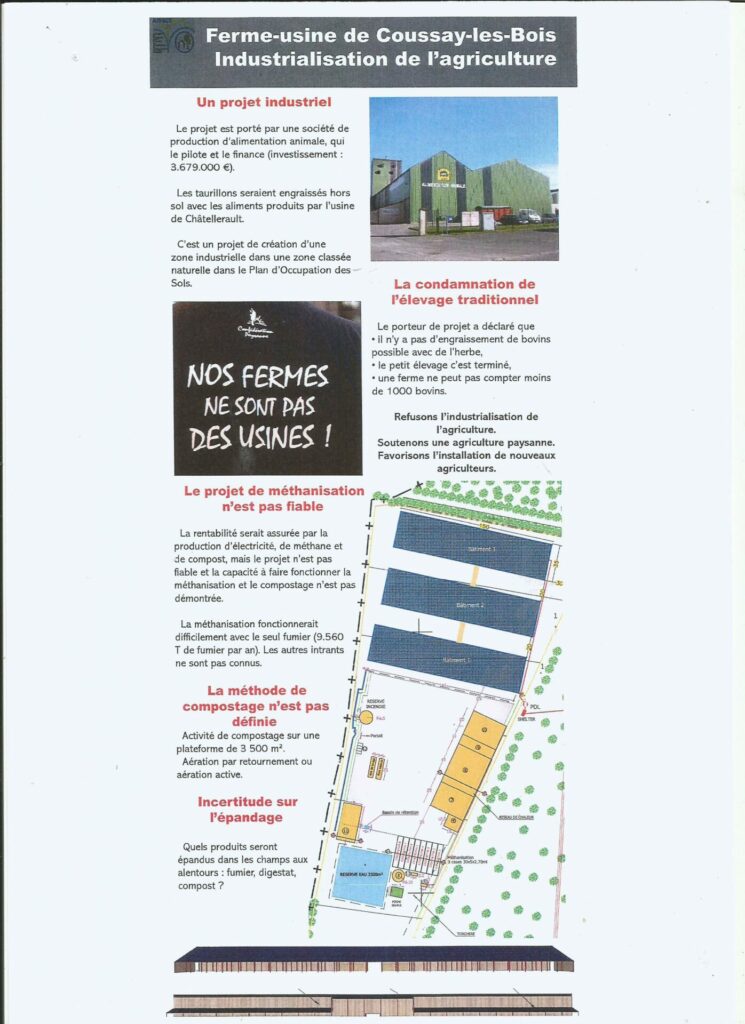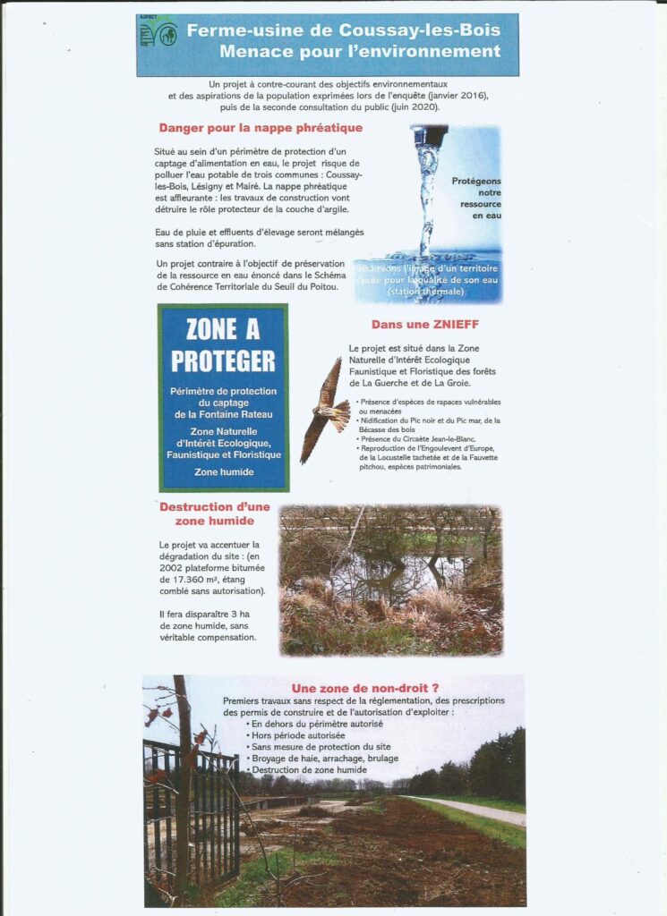 Entre colère, détermination et écœurement devant l’impossibilité (actuelle) de stopper les travaux sont intervenus Michel Favreau, maire de Coussay les Bois, Dominique Brunet, co-président d’ASPECT et François Bigot, pdt de VGCA (Vals de Gartempe Creuse Anglin) pour refaire le point sur l’ensemble des questions posées par le projet. Que ce soit sur le plan environnemental (pollution de la nappe phréatique, destruction de zones humides,…) ou administratif et réglementaire (permis de construire, configuration des bâtiments, conditions d’élevage,…) les raisons de stopper les travaux sont nombreuses et l’Etat ne fait pas son boulot, le préfet en tête. D’où l’incompréhension des opposant.es qui s’interrogent sur l’attitude des pouvoirs publics…