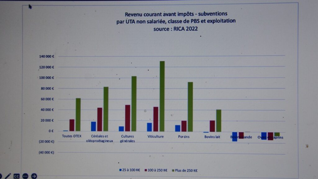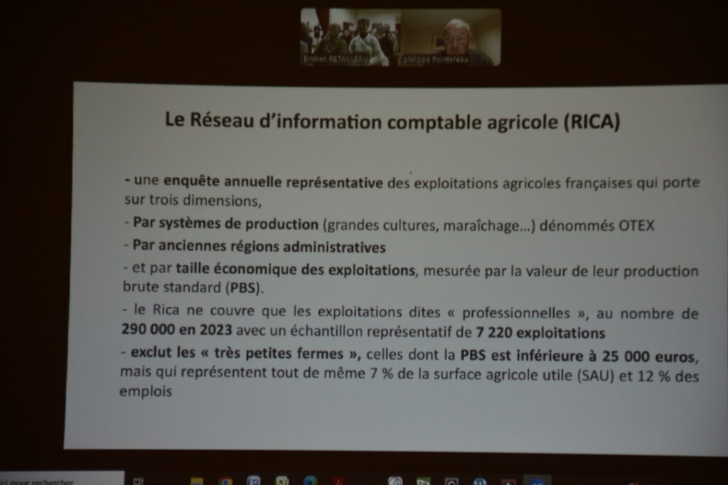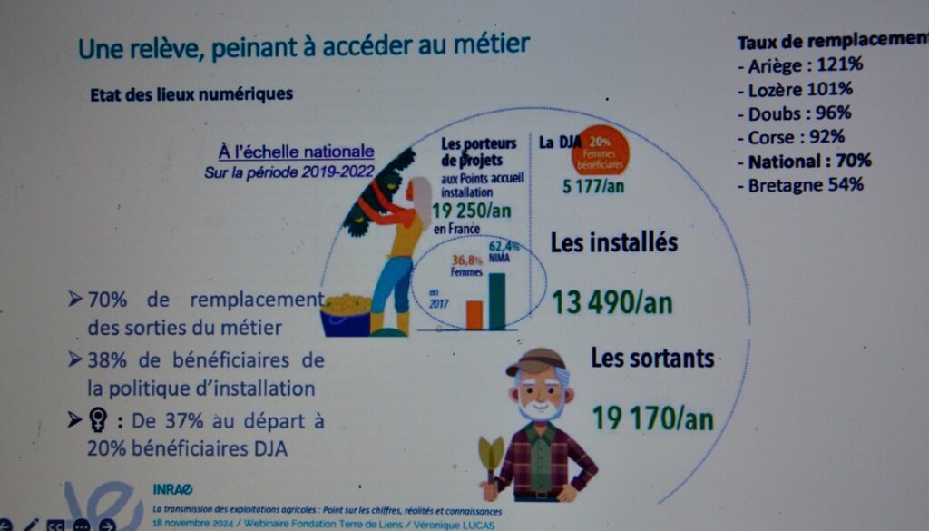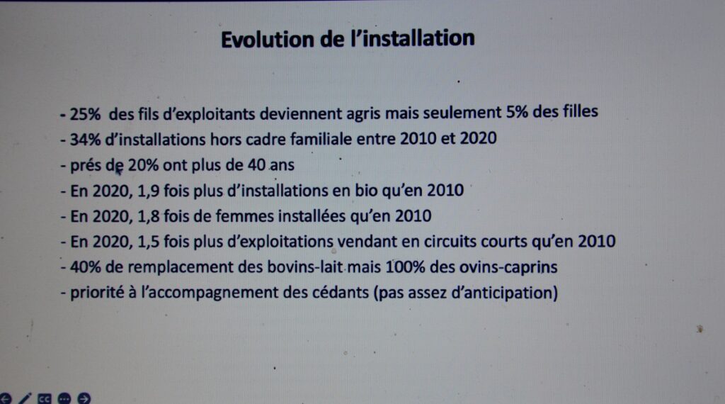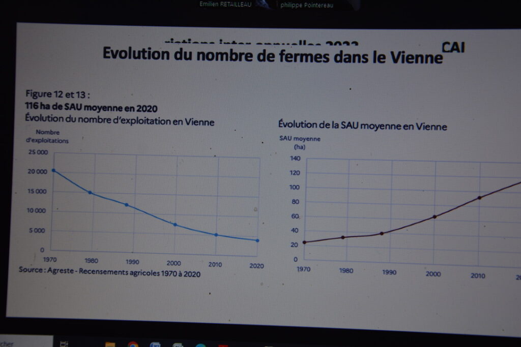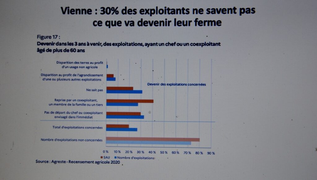 Devant plus d’une quarantaine de personnes, Philippe Pointereau, président de la Fondation « Terre de Liens » est intervenu en visio-conférence, en préambule, une quinzaine de minutes sur « Installer et transmettre : renouveler 1/4 des paysan.nes – Des faits » . Evolution des exploitations dans la Vienne, importance des écarts de revenus (et de primes PAC !) selon les filières et la taille des fermes, démographie agricole : de quoi alimenter ensuite le débat avec la salle.