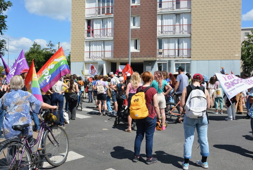 Départ de l’ilot Tison, prise de parole et direction les Trois Cités. Un arrêt avec prise de parole d’une représentante du CIDFF (Centre d’information sur les droits des femmes et des familles) a été faite devant leurs locaux, situés dans une tour du quartier. Un rappel utile de ce que représente cette association pour le droit à l’information de nombreuses femmes sur de multiples sujets. (emploi, formation, sexualité, lutte contre les violences sexistes et sexuelles,…)