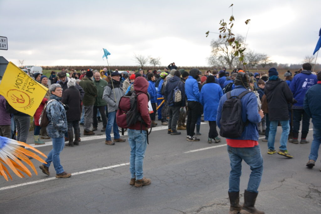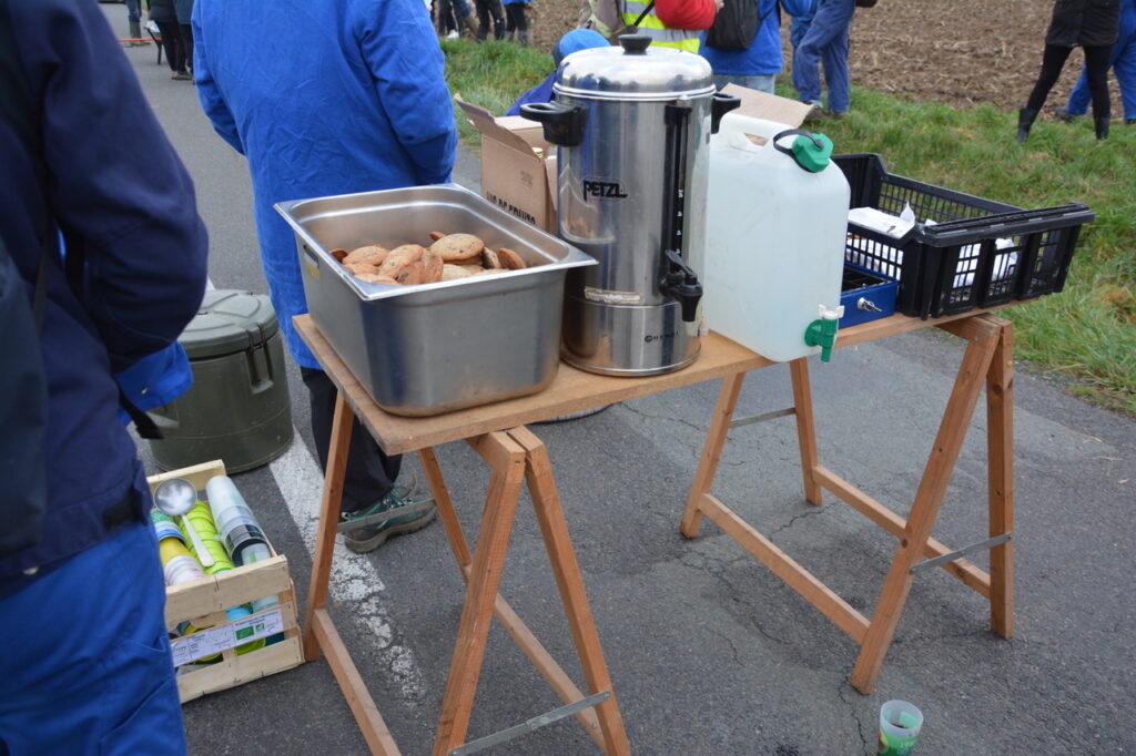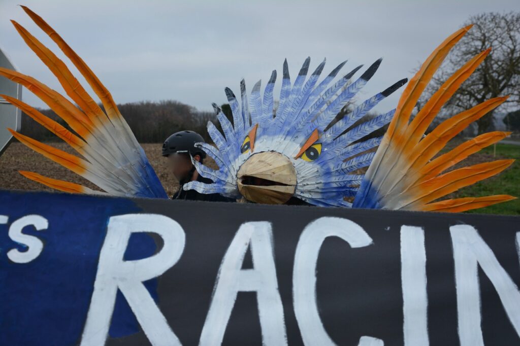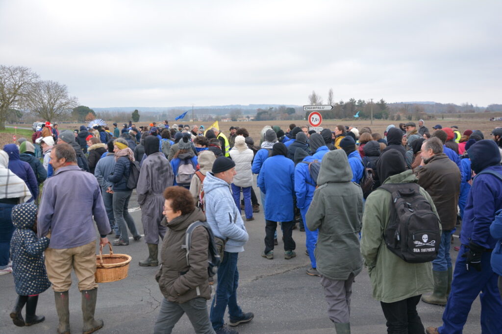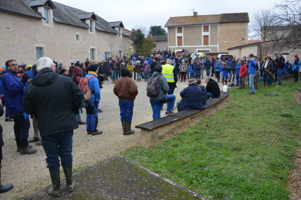 Pour éviter d’éventuels blocages sur les ponts enjambant LGV et autoroutes, un convoi de plusieurs dizaines de voitures (et de vélos !) a fait les 3 kms qui séparaient St Léger de la parcelle « à planter » . Des arbres, des arbustes, près de 500 mètres de haies plantés en une heure… on espère seulement que le propriétaire de la parcelle (Bertrand Lamarche, irrigant qui préside « Rés’eau Clain » porteuse des 30 projets de méga-bassines sur le bassin du Clain…) respectera les arbres plantés. Une activité des plus pacifiques qui au final, n’a posé aucun problème avec la gendarmerie présente en nombre sur place et dans les environs. Gendarmes qui n’ont pu goûter aux joies du vin chaud et des cookies préparés par « Mange ta langue » , la cantine populaire qui assurait le casse-croûte. Une belle journée donc, en présence de 300 racineurs et racineuses, journée qui prépare les prochaines mobilisations du printemps et de l’été. (du 14 au 21 juillet en Poitou…)