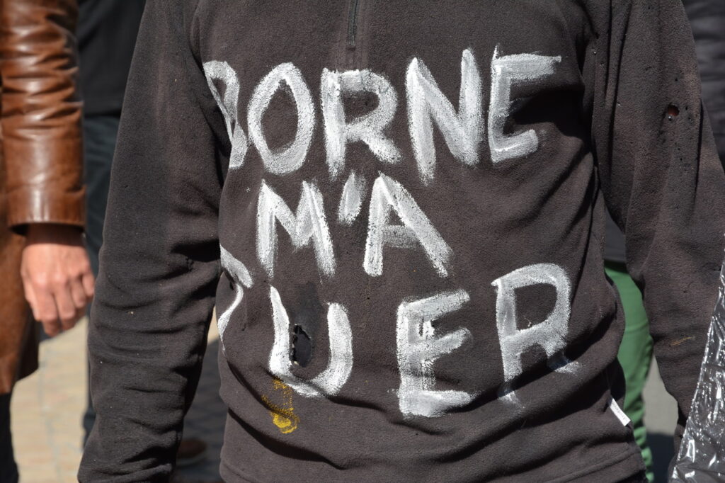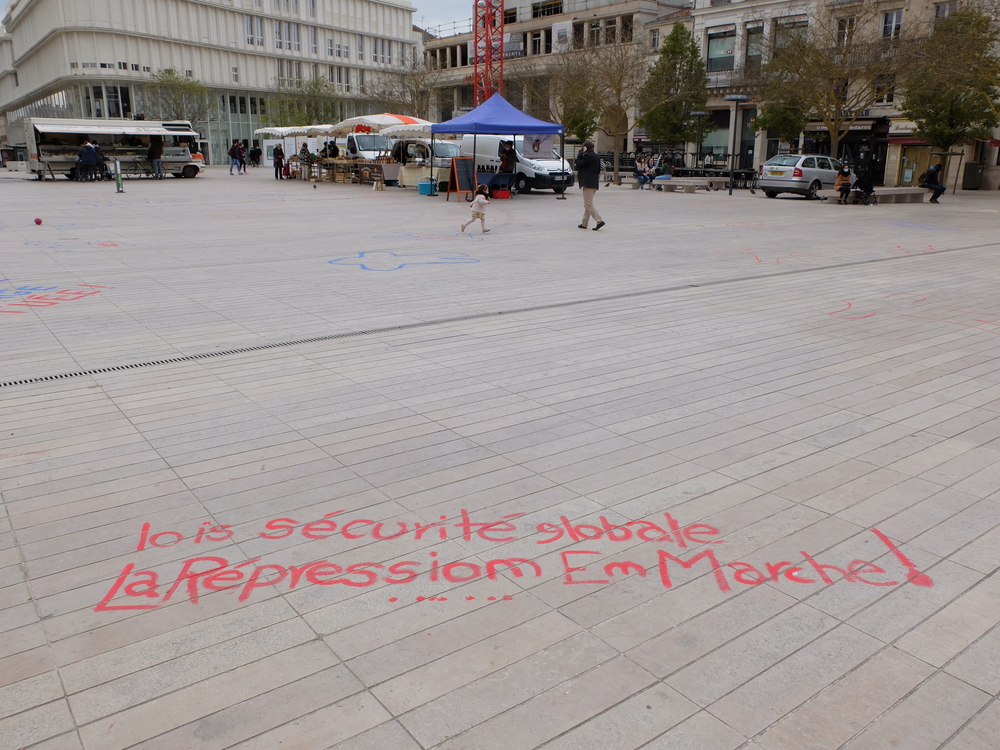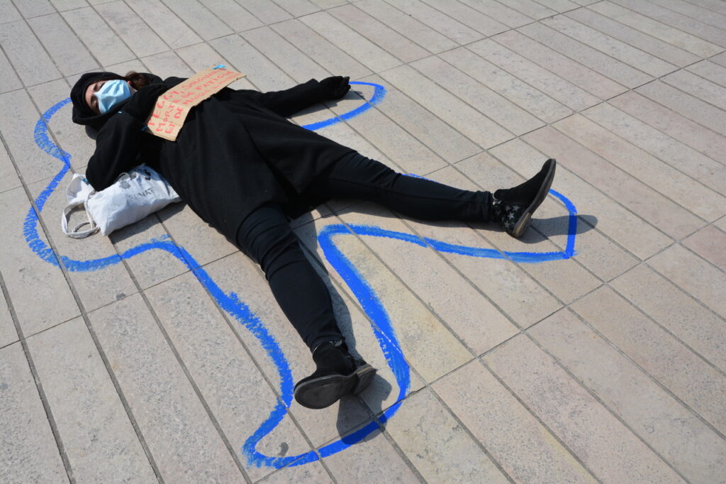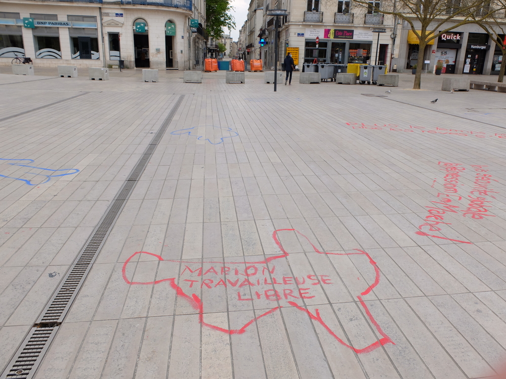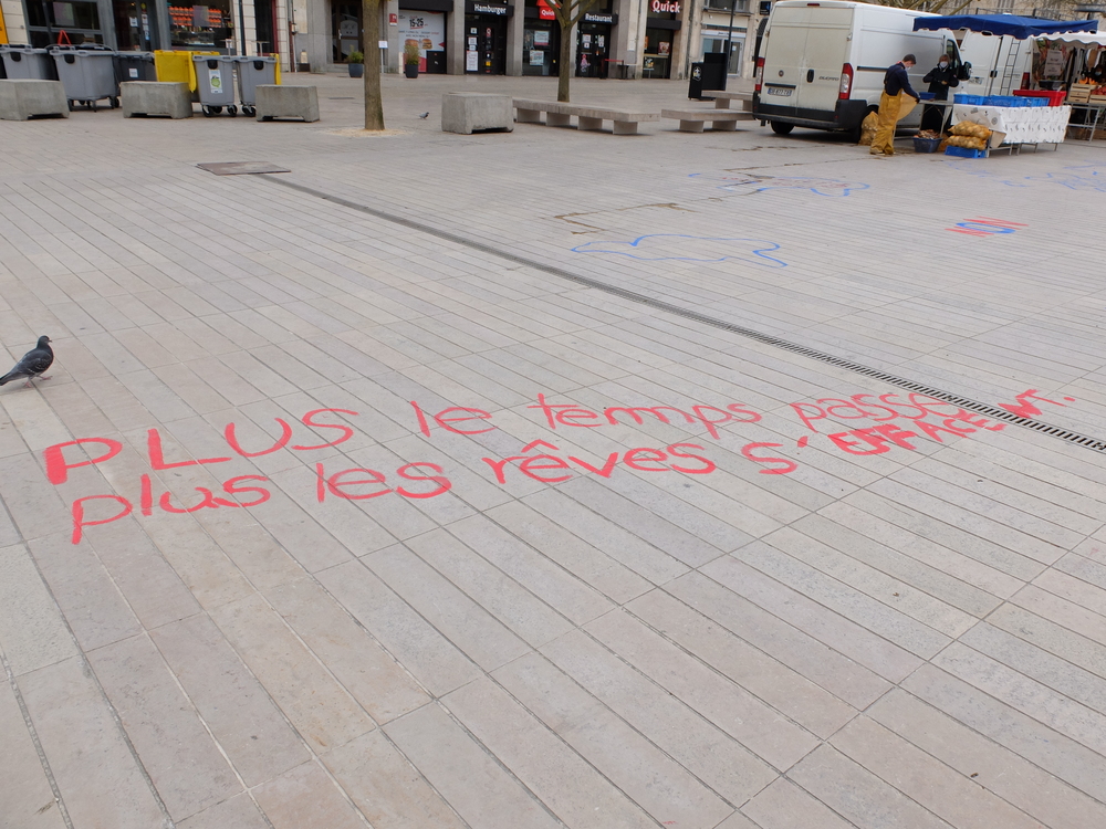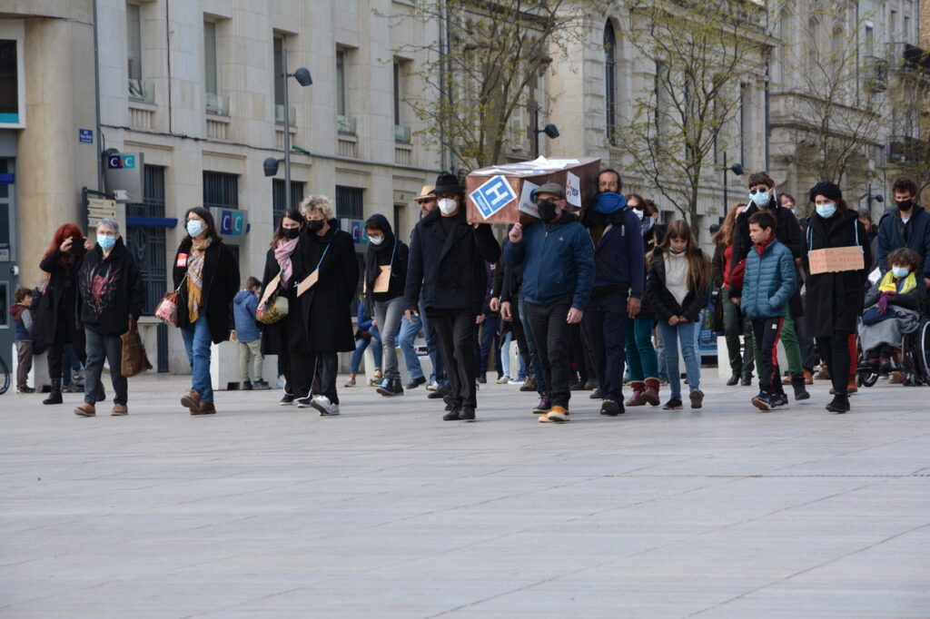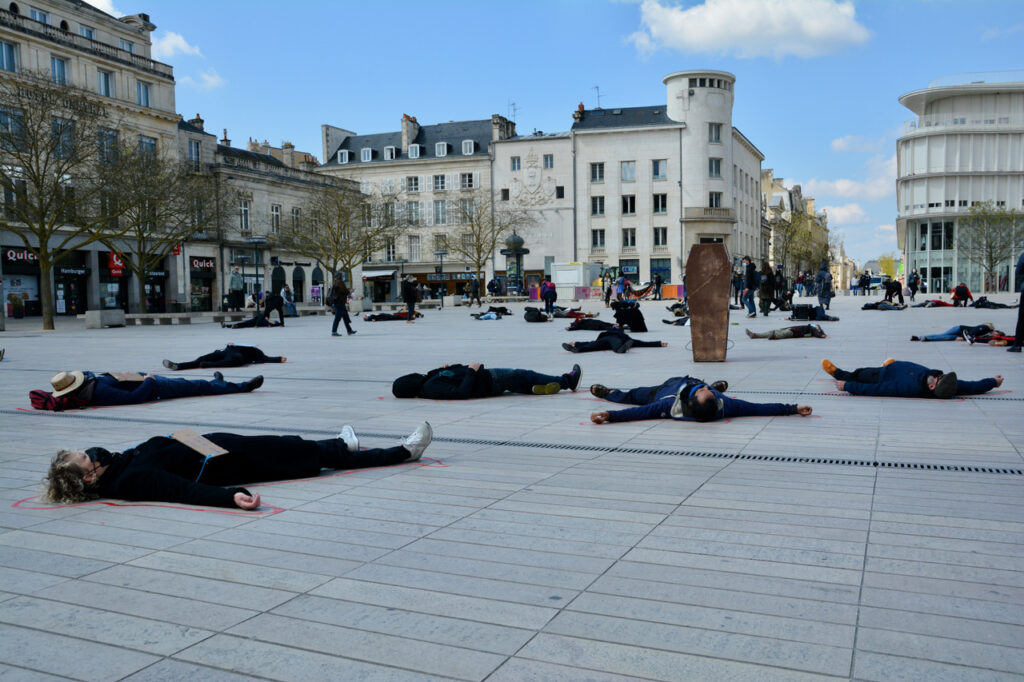 Le défilé, funèbre, parti de la gare est passé devant le TAP avant de rejoindre la place de l’hôtel de ville où symboliquement des silhouettes ont été tracées sur le sol… pour figurer toutes ces personnes sacrifiées…