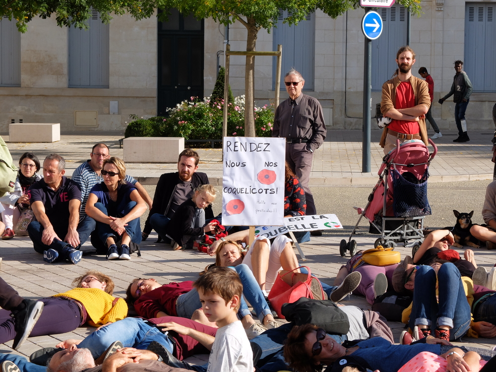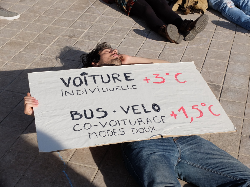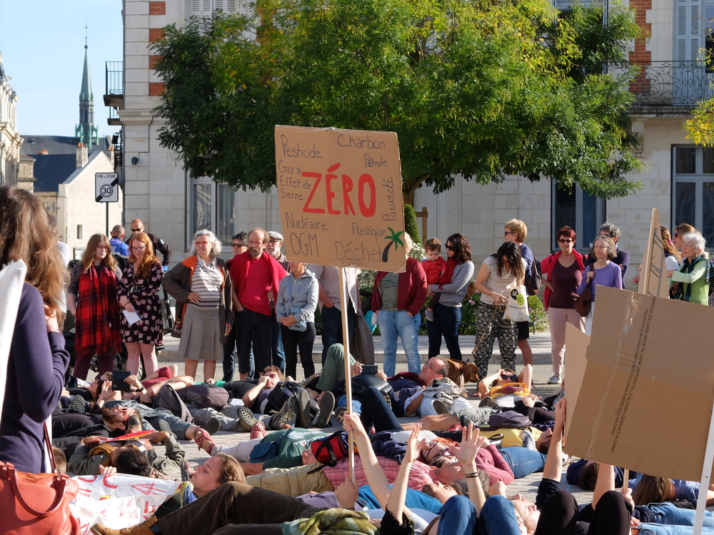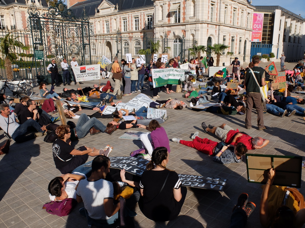 Die-In devant la préfecture de Poitiers. Le message adressé à l’État : « et un et deux et trois degrés, c’est un crime contre l’humanité »