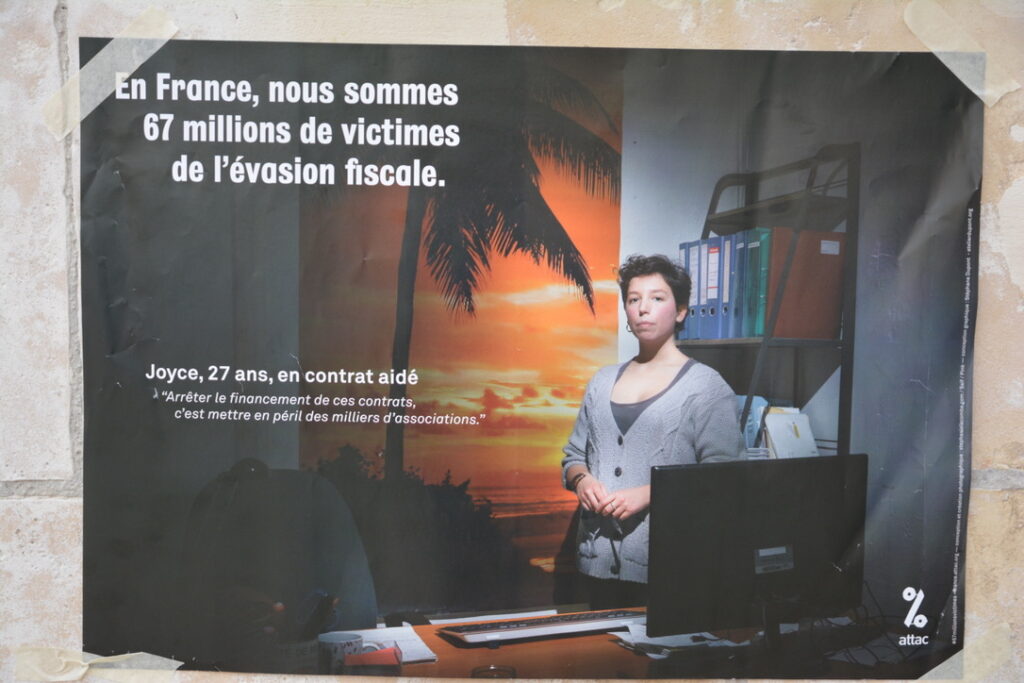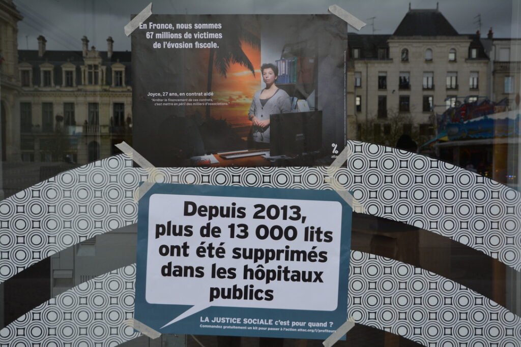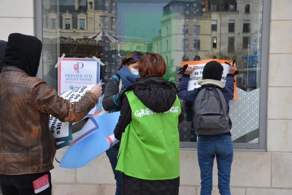 L’occasion aussi de partager cette mobilisation avec d’autres mouvements venus en soutien de ces actions. A Poitiers, Attac86, avec l’aide de XR, Greenpeace et Alternatiba étaient là et ont donné un bon coup de main : ainsi près d’une vingtaine de personnes étaient présentes sur une « scène de crime d’évasion fiscale », en l’occurrence l’agence de la BNP-Paribas de la place de la mairie qui s’est trouvée décorée d’une magnifique banderole, d’affiches et de rubalise !