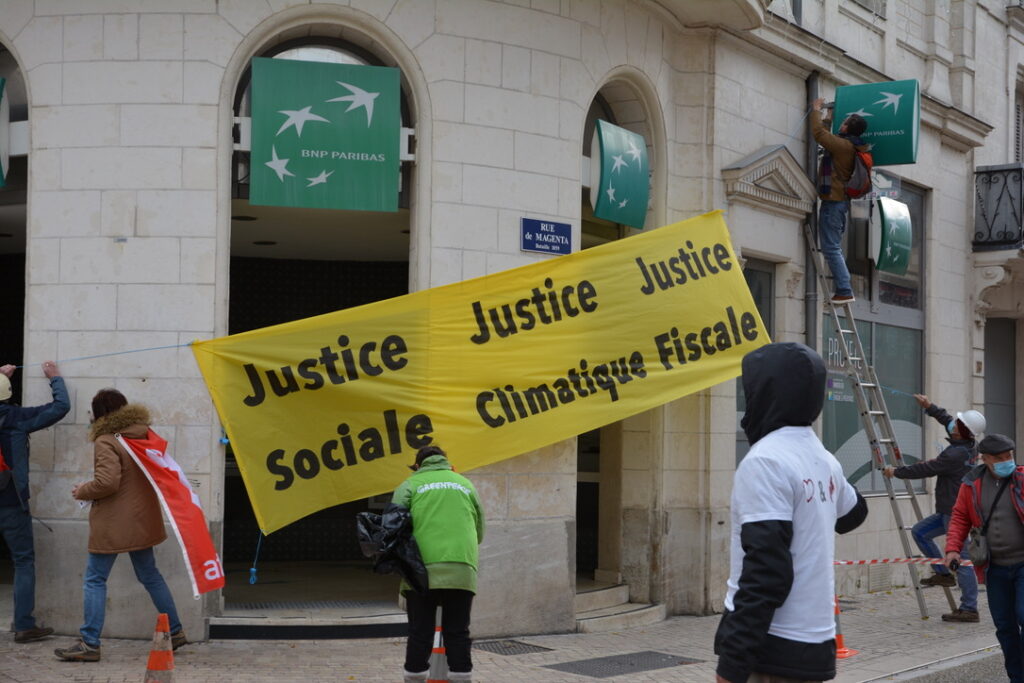 La cible choisie à Poitiers était la BNP-Paribas, championne dans ce domaine ainsi que dans le financement des énergies fossiles avec une technique élaborée dans les déclarations d’intention et la « communication verte ».