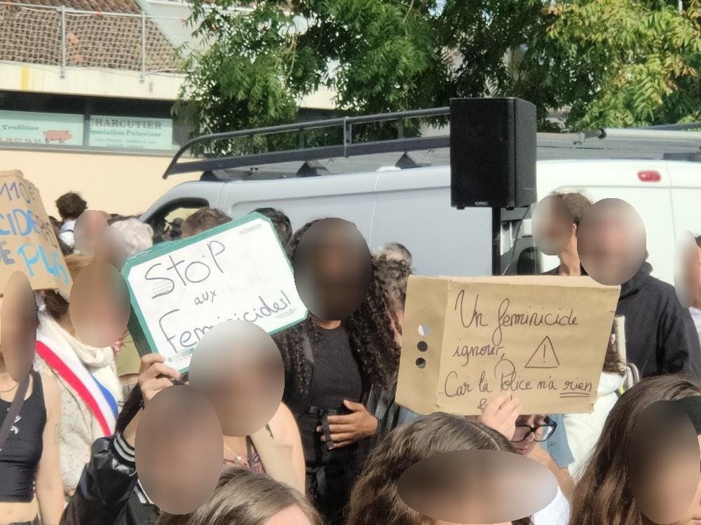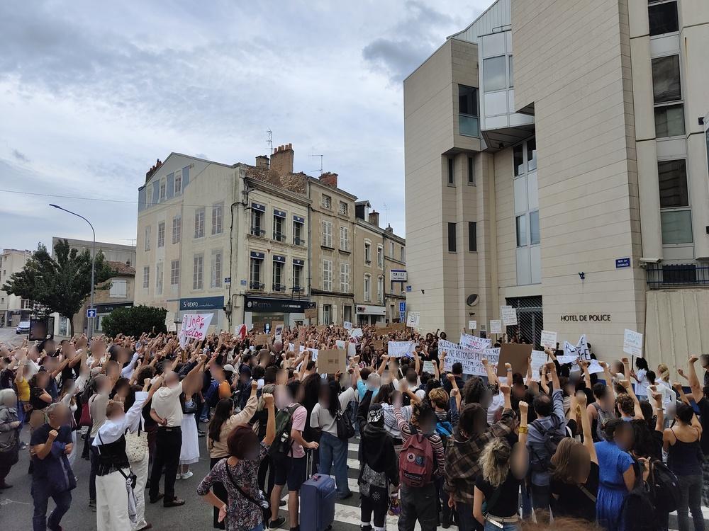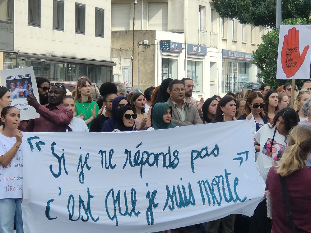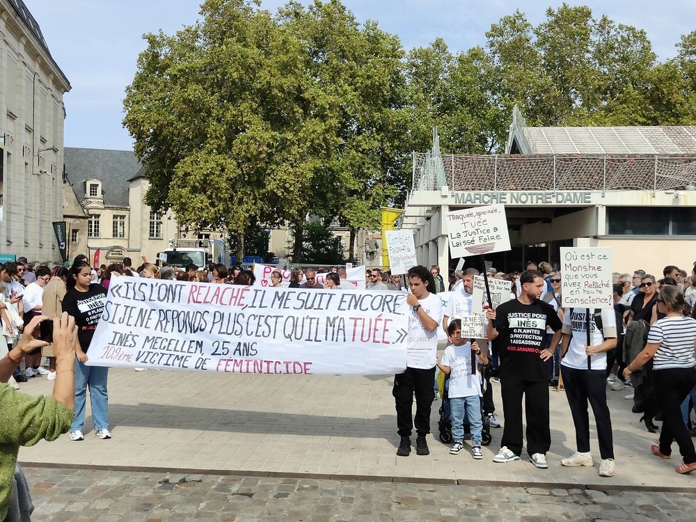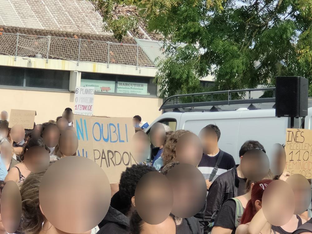 Le cortège de 1 200 à 1 500 personnes est arrivé devant le Commissariat de Poitiers, là où Inès a 6 fois déposé plainte, là où a été entendu puis aussitôt relâché plusieurs fois son agresseur qui est devenu son assassin, toujours en fuite.
