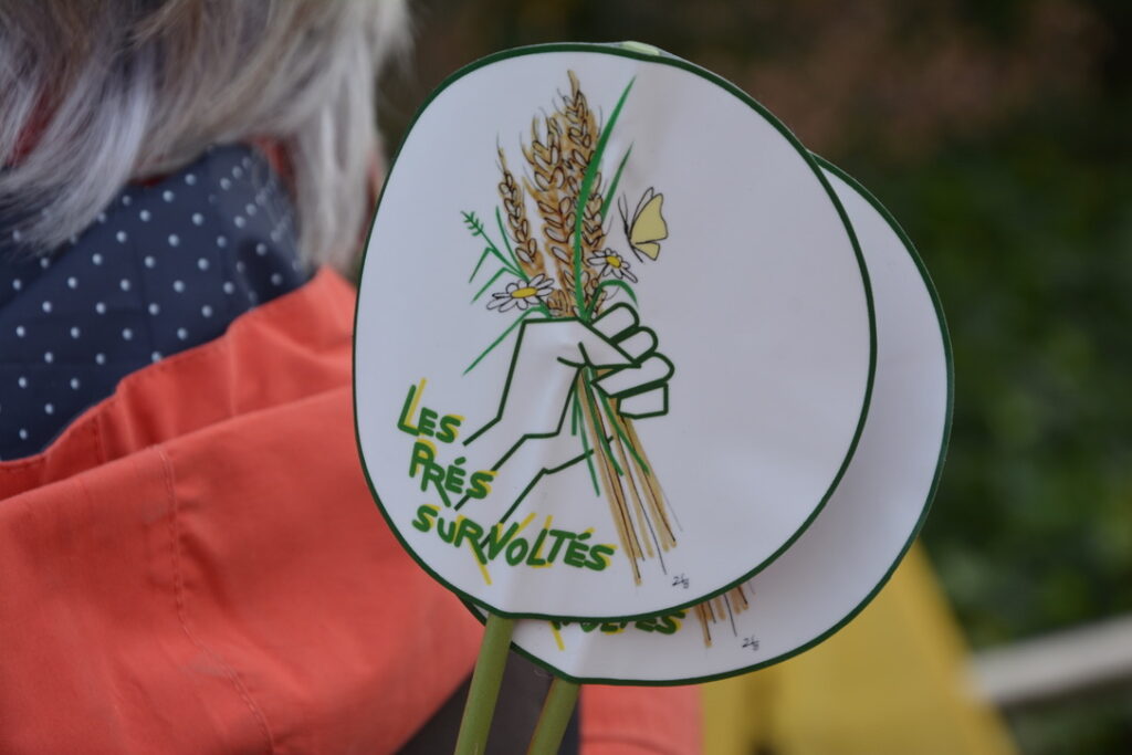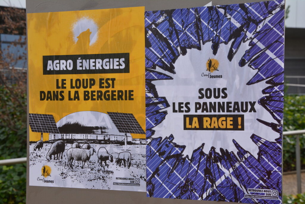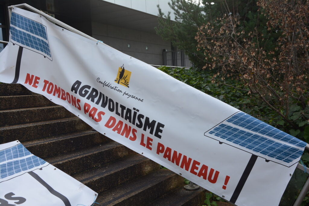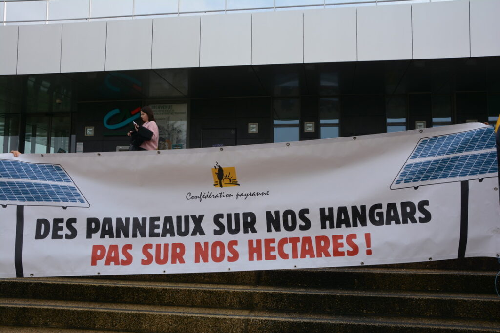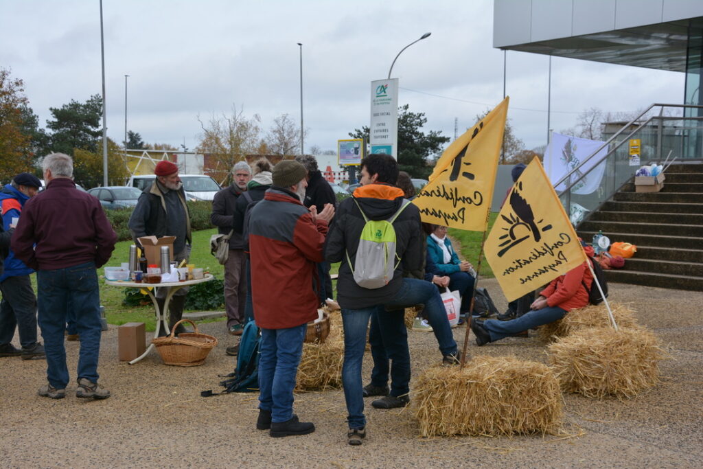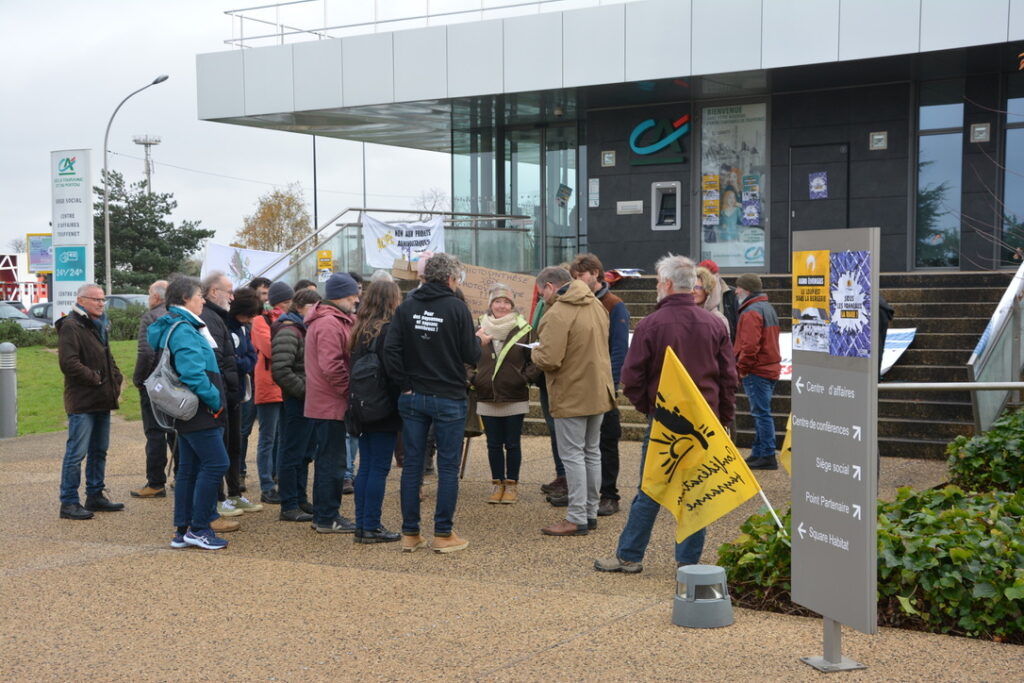 Mardi matin donc, une quarantaine de personnes de la Confédération Paysanne de la Vienne et de l’association « Les Prés survoltés » (https://www.helloasso.com/associations/les-pres-survoltes) s’étaient données rendez-vous devant le Crédit Agricole qui accueillait une série de conférences dédiées au développement du solaire sur des surfaces agricoles.