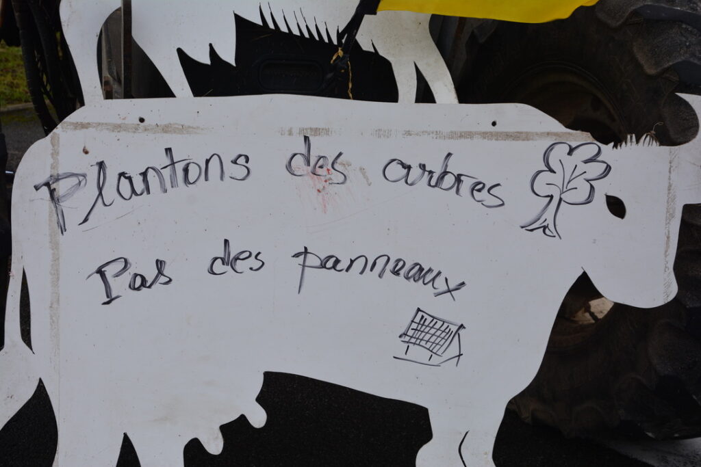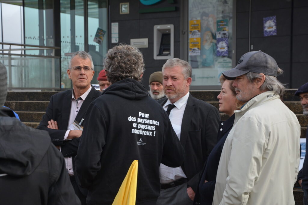A midi, Guillaume Riou, vice-président de la région Nouvelle Aquitaine (chargé de la transition écologique et énergétique) et Hervé Druon (directeur de l’Institut National de l’Energie Solaire) sont venus dialoguer avec les manifestant.e.s. Deux représentant.e.s des manifestant.e.s devaient prendre la parole pendant l’après-midi pour développer leurs arguments en défense d’une agriculture qui assure un revenu décent aux paysans et paysannes. Cela, plutôt que de couvrir, à grande échelle, des champs de panneaux solaires. Un complément de revenu ? Une substitution plutôt !