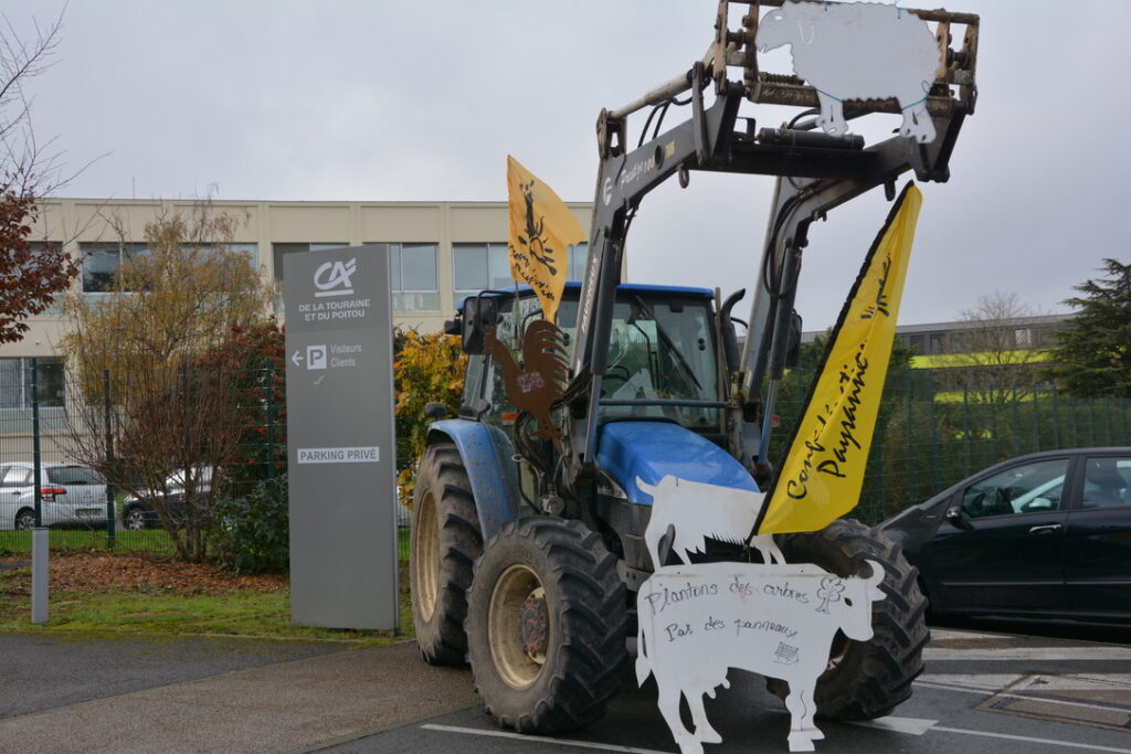 Action de la Confédération Paysanne de la Vienne avec la présence de l’association « Les prés survoltés » mardi 26 novembre devant le site du Crédit Agricole, juste en face du parc des expos à Poitiers.