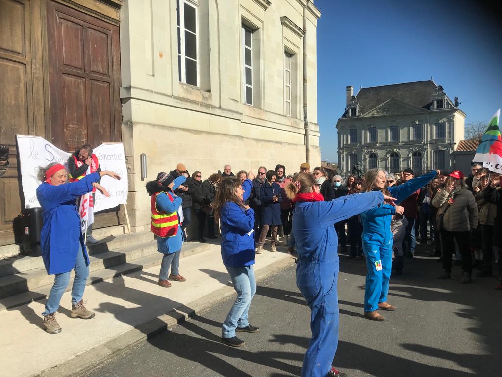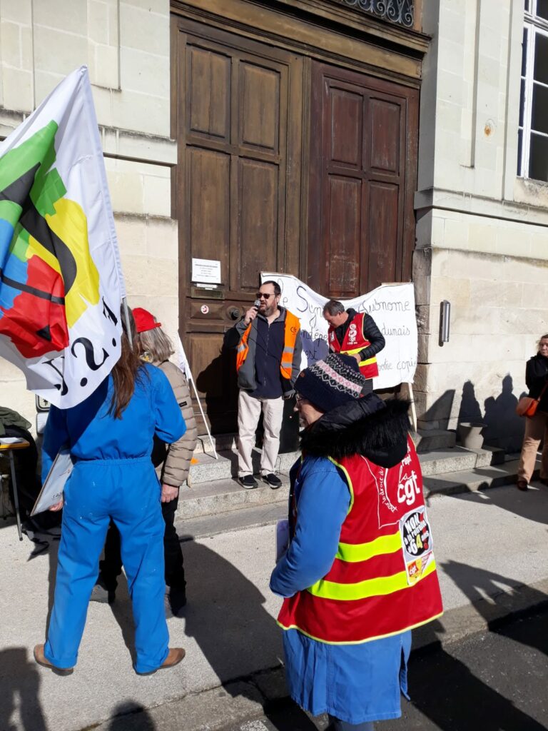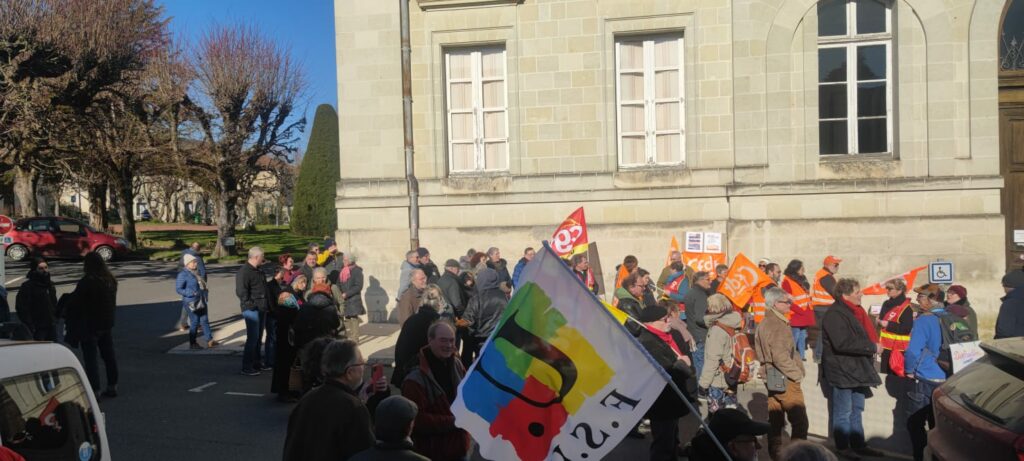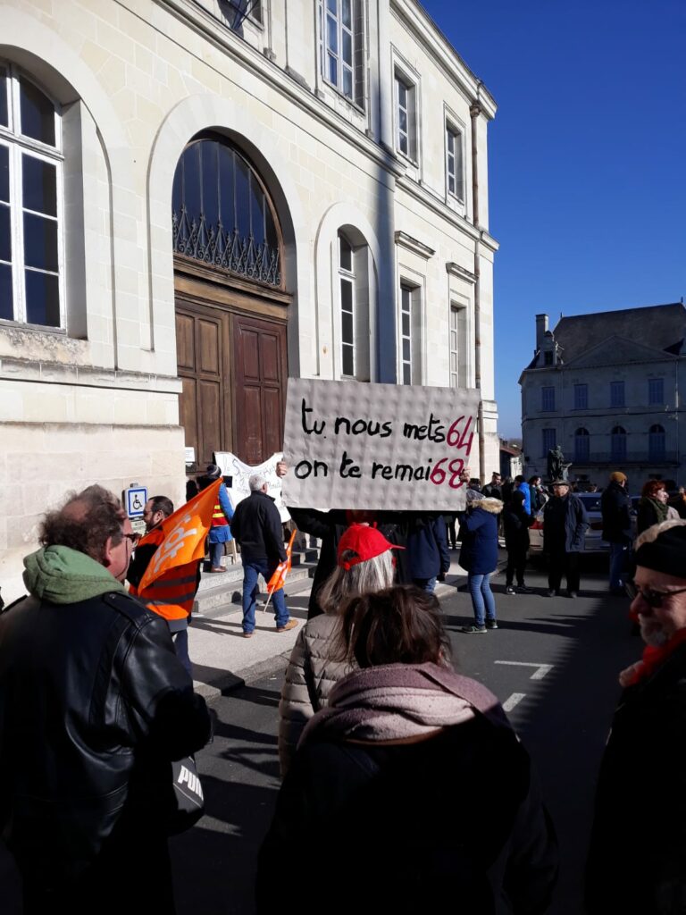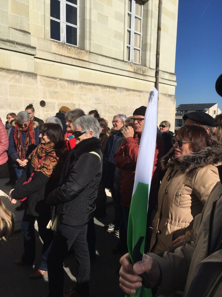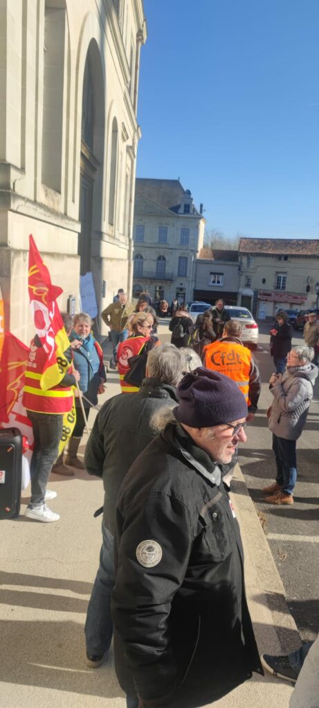 A Loudun, ce samedi 11 février, à l’appel de l’intersyndicale, nous étions au moins 200 rassemblé.es devant la mairie à midi.