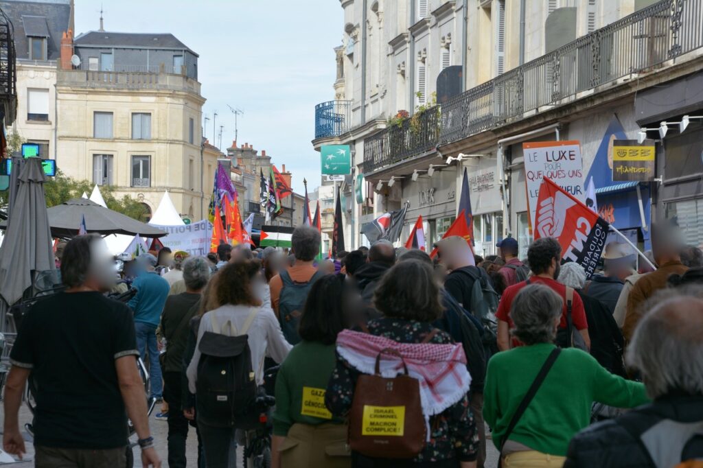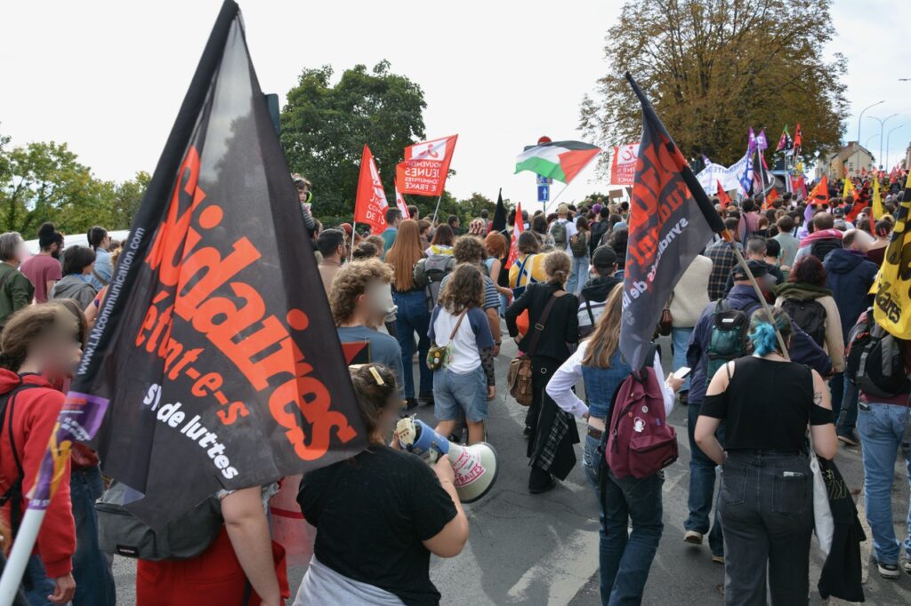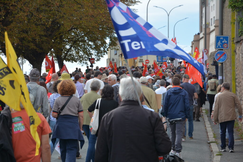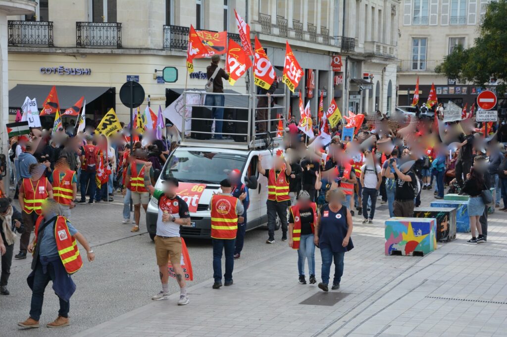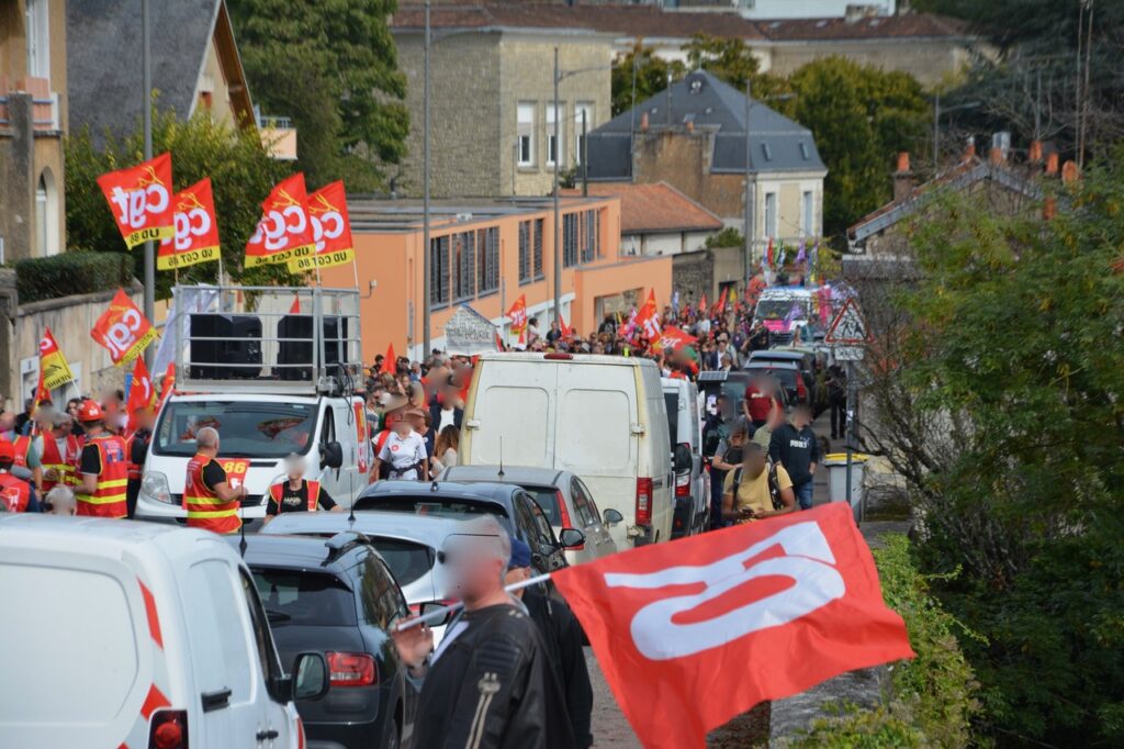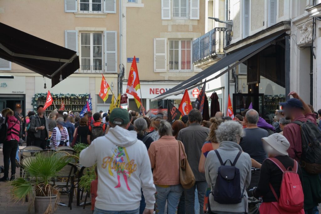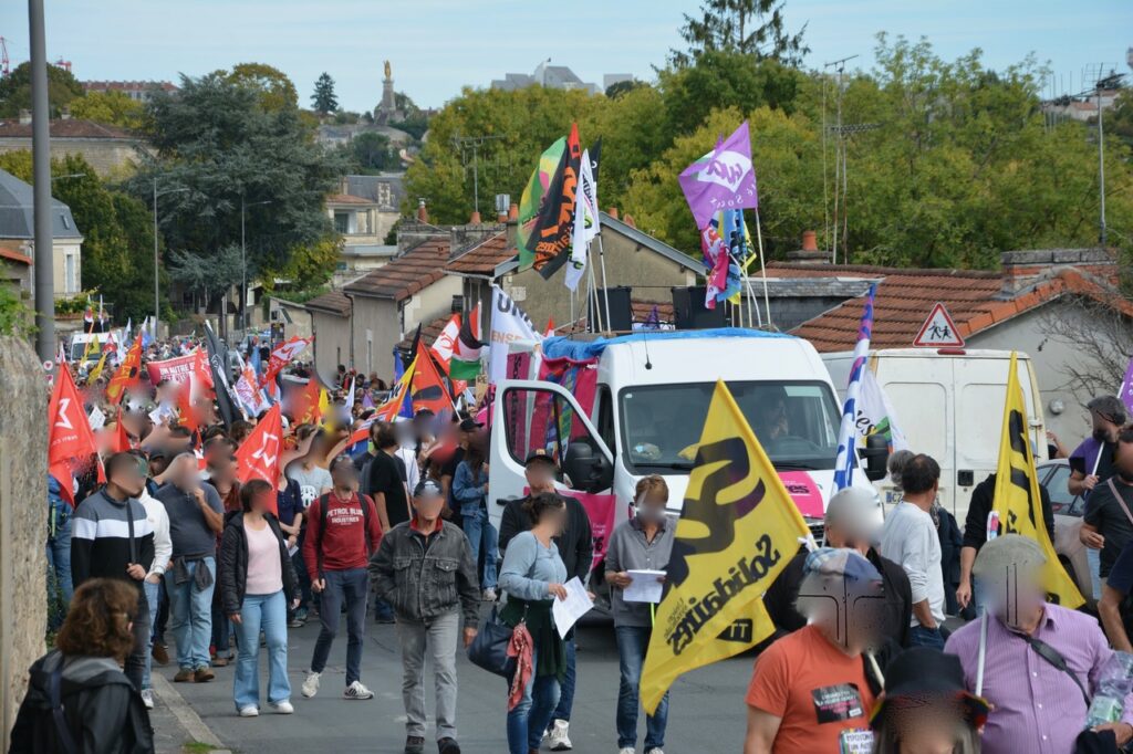 Alors, cette mobilisation poitevine ? Du monde encore ? Bah, si on compare avec le 18 septembre, y’a pas photo, la mobilisation était en baisse avec de petits cortèges (UNSA, CFTC, et même la CFDT), d’autres un peu plus conséquents (FO). Les plus gros ? Par ordre d’importance, la FSU, Solidaires et la CGT. La (seule) bonne surprise, c’est un cortège « Jeunes » très conséquent (plusieurs centaines) et très animé. Sans doute, au final la moitié de la manifestation du 18 septembre… Un bon 2 500 ?