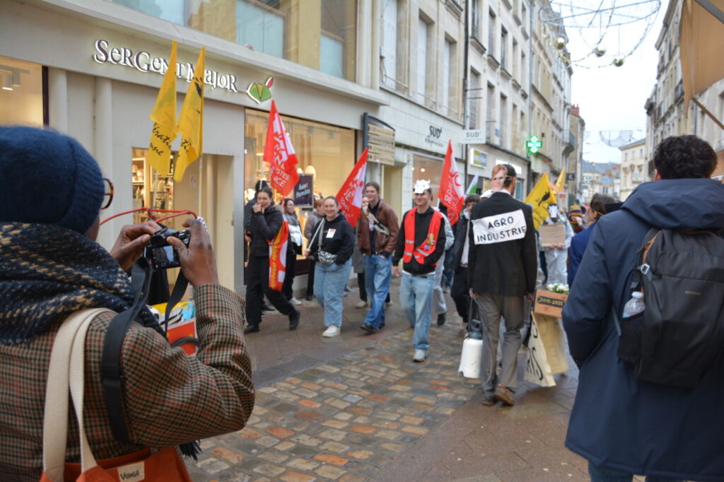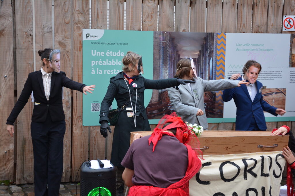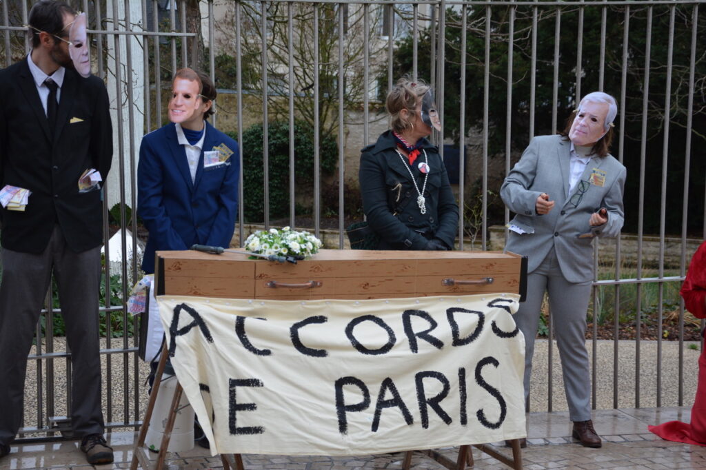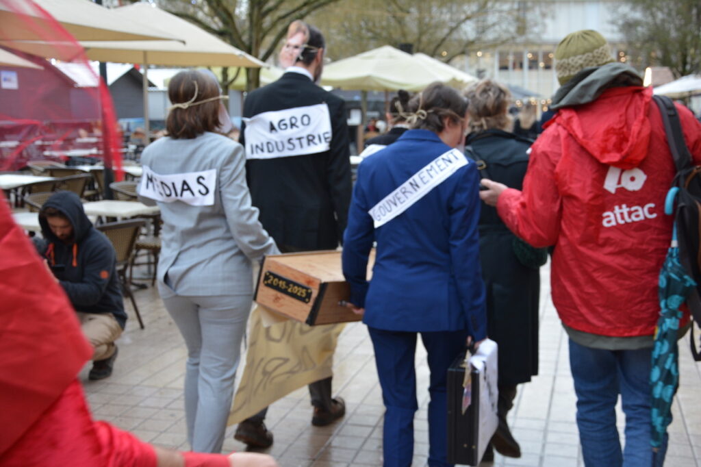 « A bas la planète, vive les actionnaires » ,… « CAC40, CAC40, Ouais, ouais ! » Des slogans volontiers provocateurs, entendus dans les rues du centre-ville de Poitiers samedi 20 décembre ! Une manière décalée d’enterrer les « Accords de Paris » sur le climat, accords signés en 2015 et sans grand résultat 10 ans plus tard. Le groupe poitevin d’XR avec le soutien d’ATTAC86 et de Greenpeace Poitiers avait décidé de perturber un peu ce samedi précédent Noël, un samedi plein de monde dans les rues… : un enterrement de première classe avec Bernard Arnault, Bolloré, Rousseau (de la FNSEA !) et quelques autres comme porteurs de cercueil. (en bas de page le tract A5 distribué pour l’occasion)
