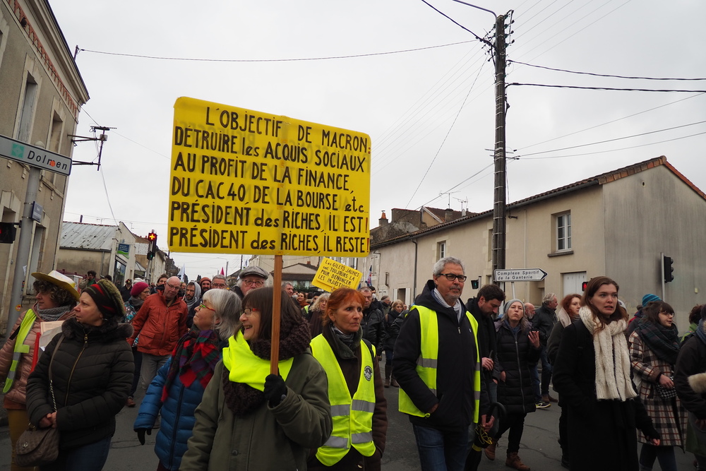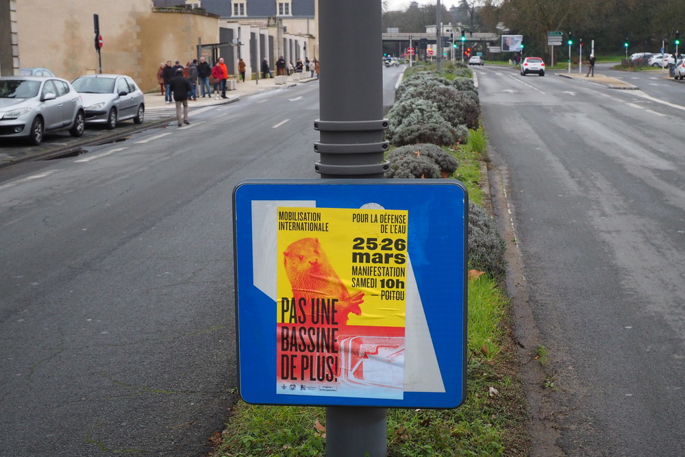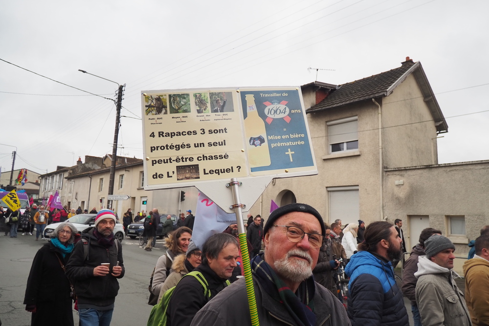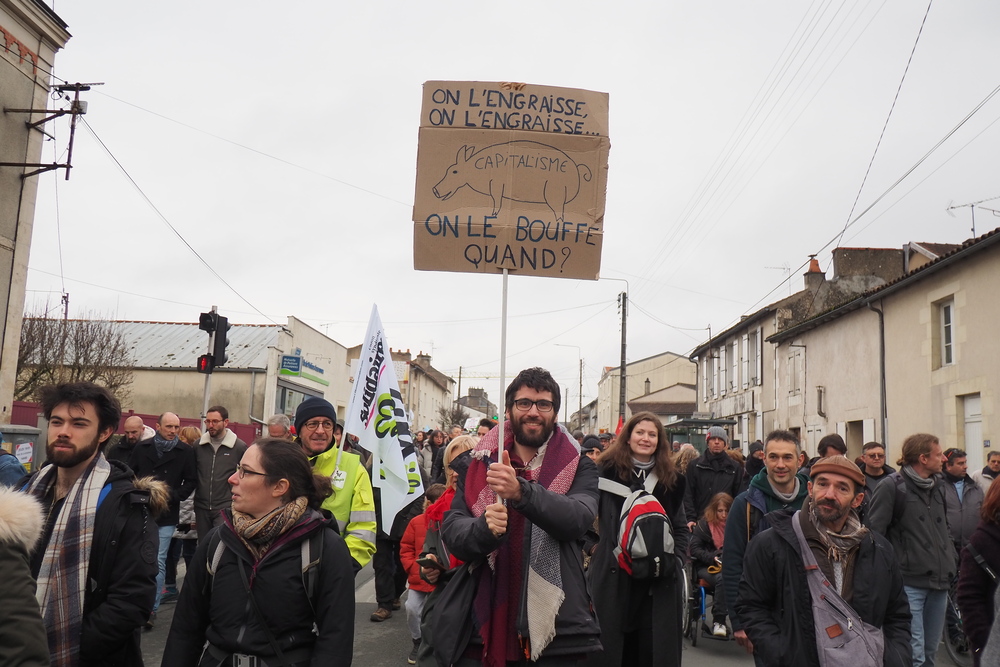 Et tout au long de la manifestation était rappelé par des affiches et des tracts que Macron et ses amis de la FNSEA veulent continuer de privatiser l’eau potable (qui manque) pour le plus grand bénéfice de quelques gros exportateurs productivistes. Tiens ! ? Là aussi c’est la même logique !