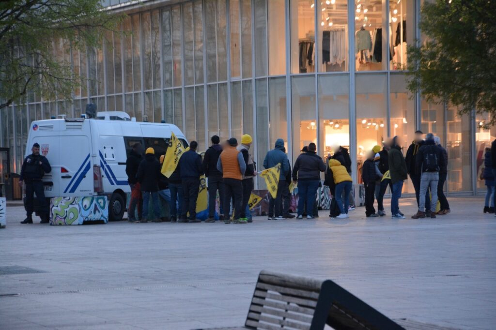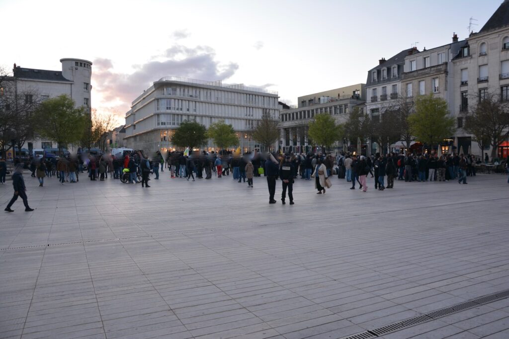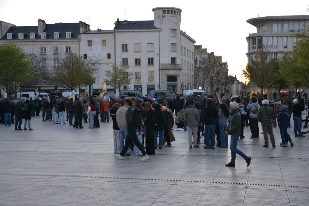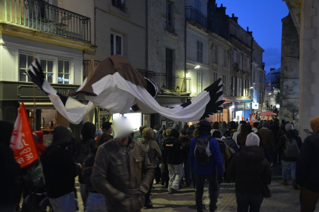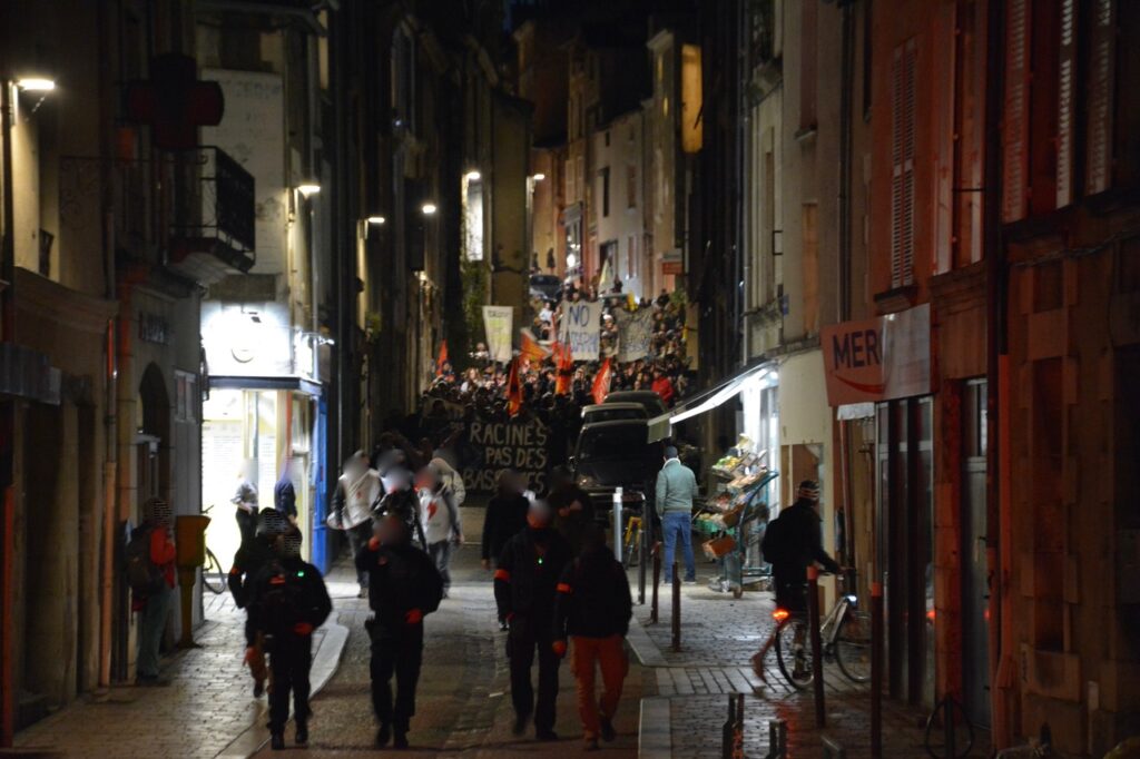 On aura surtout noté la présence d’une douzaine de véhicules Police/CRS et quelques échauffourées entre CRS et CR86 rue de la regratterie et autour de la place du marché. Le tout pour éviter le contact direct entre manifestant.es et pro-bassines.