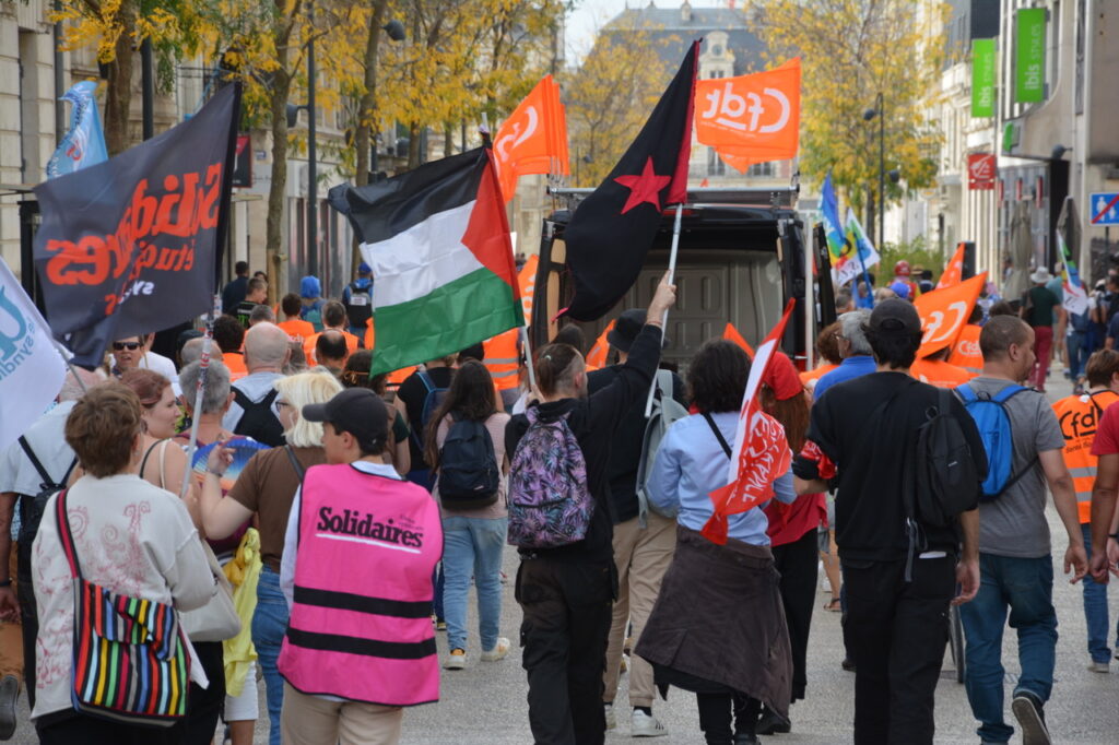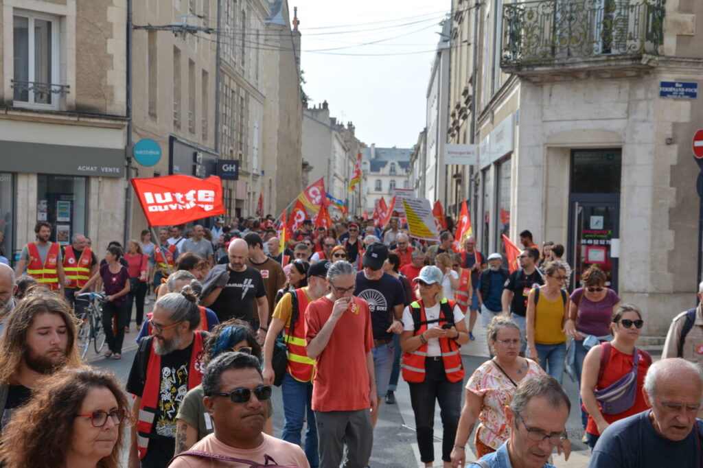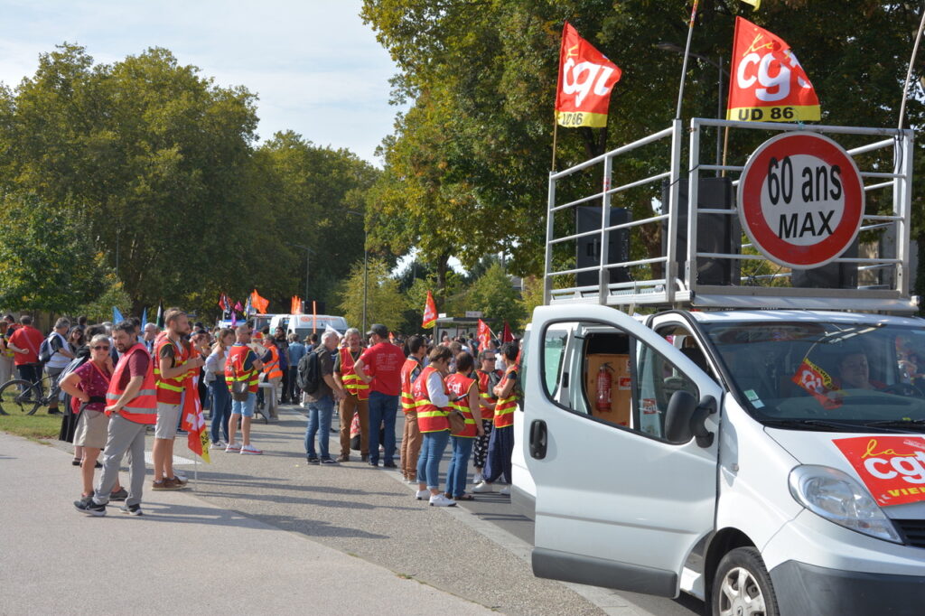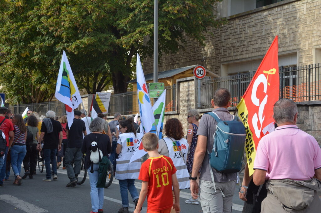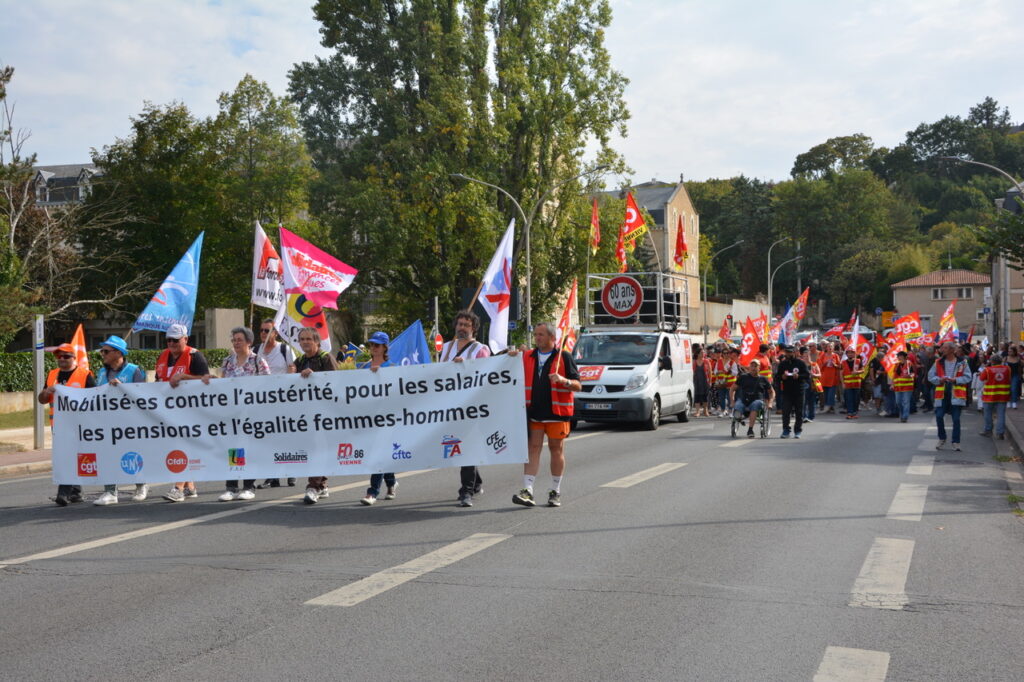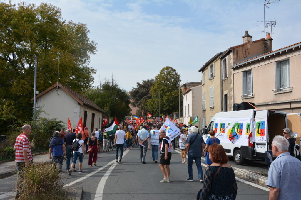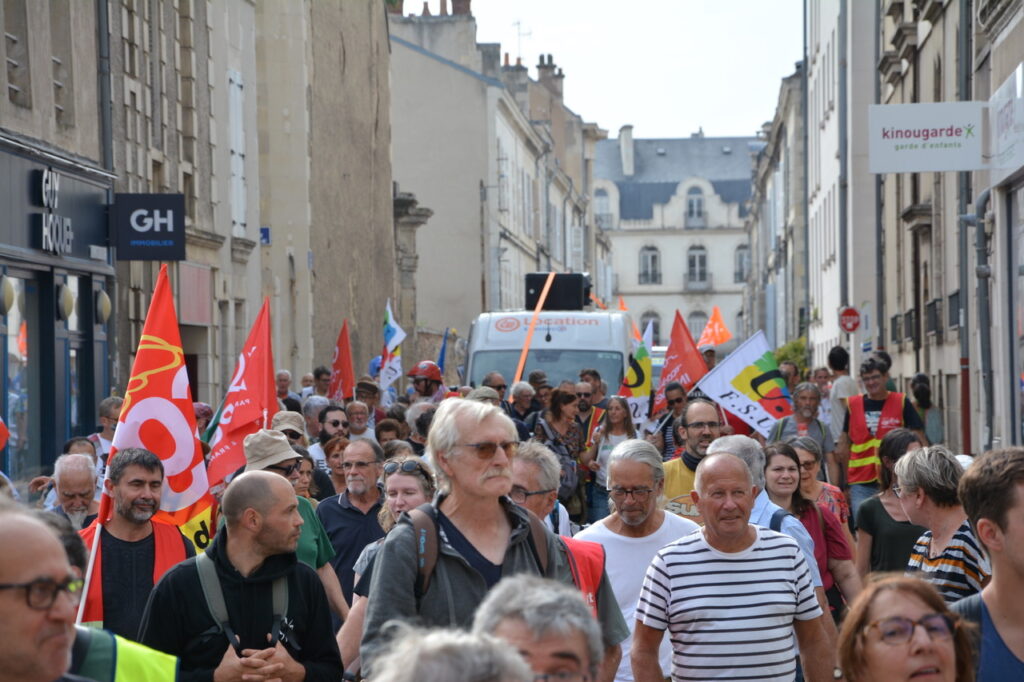 Une grande première : une grève européenne et interprofessionnelle ! Environ 500 personnes à Châtellerault le matin et à Poitiers, nous partîmes à 600 et arrivâmes à plus de 1 200 (1 300 selon la CGT) ! Bon cortège de la CGT, de Solidaires, suivie de la FSU, présence pas négligeable de la CFDT, un bon groupe de la CFTC, les autres se faisant discrets… Des jeunes aussi et les retraité.e.s toujours là, qui participent largement à ces mobilisations. Sans doute pas la manif du siècle mais au final, une bonne mobilisation étant donné l’ambiance du moment.