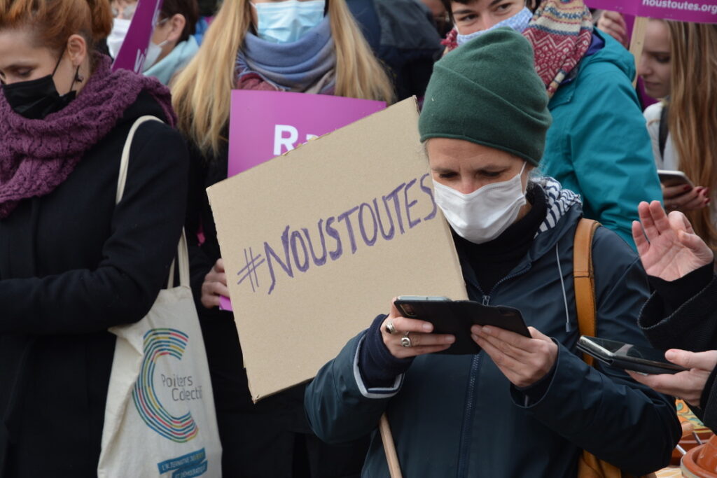 De 130 à 150 personnes étaient réunies pour une « Marche contre les violences sexistes et sexuelles » à l’appel du collectif « Nous toutes » sur le marché des Couronneries ce dimanche matin 21 novembre. Au milieu des badauds s’interrogeant parfois sur le sens de cette manifestation, des témoignages sur des situations personnelles, de la gravité, de l’attention et de la colère aussi parmi les manifestant.es. A remarquer la jeunesse de beaucoup de participant.es, des pancartes nombreuses, des chants et des prises de parole. La présence aussi d’élu.es de Poitiers dont la maire, Léonore Moncond’huy.
