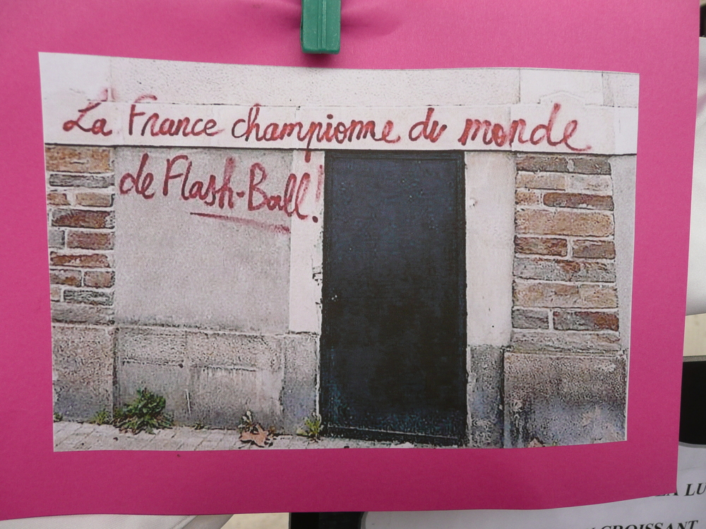 Ci-dessus l’objet qui m’a heurté alors que nous cherchions à contourner un barrage policier de la voie principale, en passant par une cité d’immeubles. Un barrage de 2 véhicules et 8 policiers qui ont lancé des grenades assourdissantes et des fumigènes irritantes. Je ne sais pas de laquelle des 2 cette pièce provient. Je sors de là un peu choqué, je dois avouer.