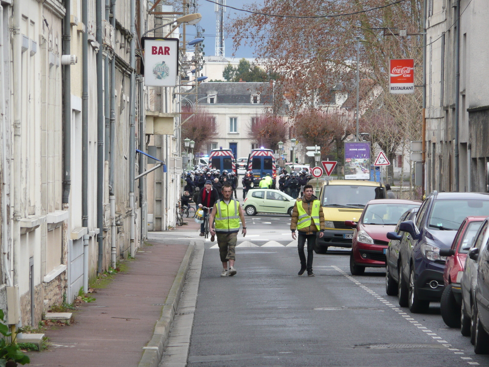 Le gros des manifestants a passé le fleuve par le pont de chemin de fer puis s’est déclaré une course poursuite avec blocages successifs de toutes les issues par les gendarmes qui ont fait usage de grenades dispersant des galettes fumigènes de produits irritants et de grenades assourdissantes.