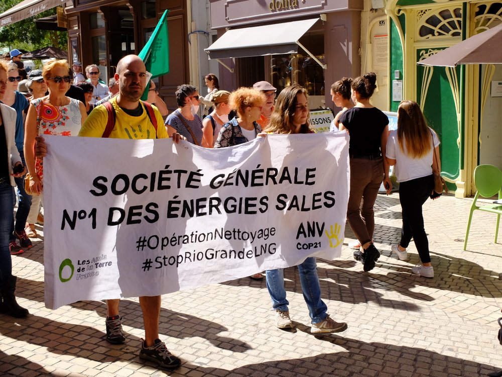 Le tout nouveau groupe ANV-COP21 (Action Non Violente) et les Amis de la Terre rappelaient l’implication actuelle de la banque « société générale » dans le dérèglement climatique