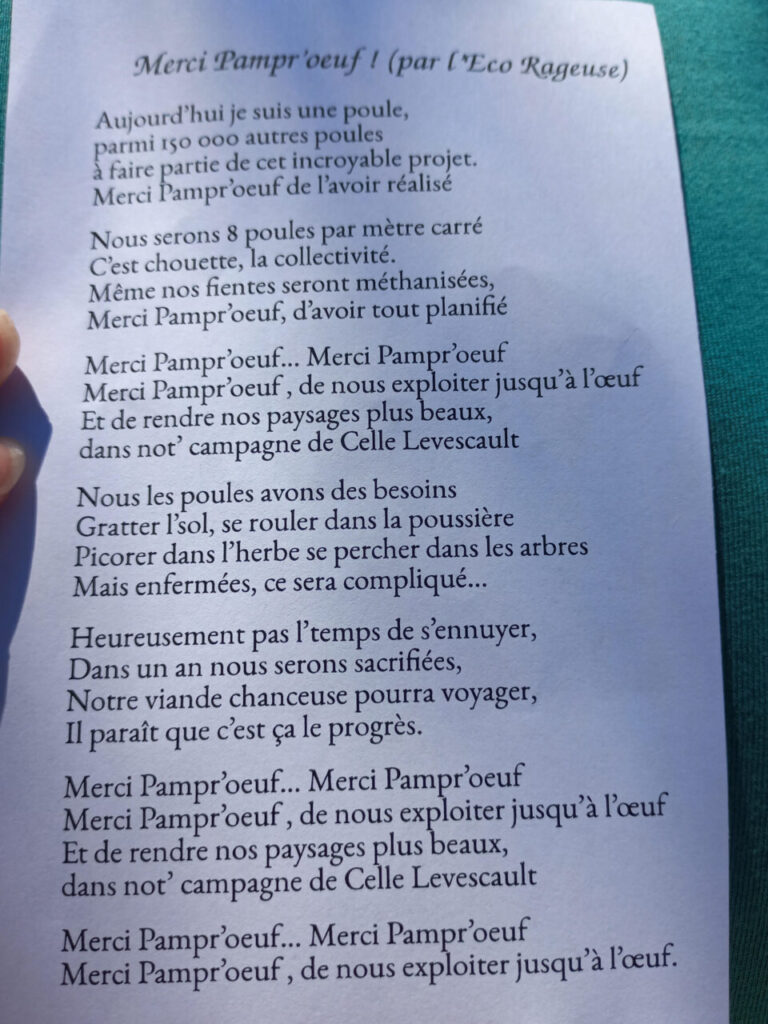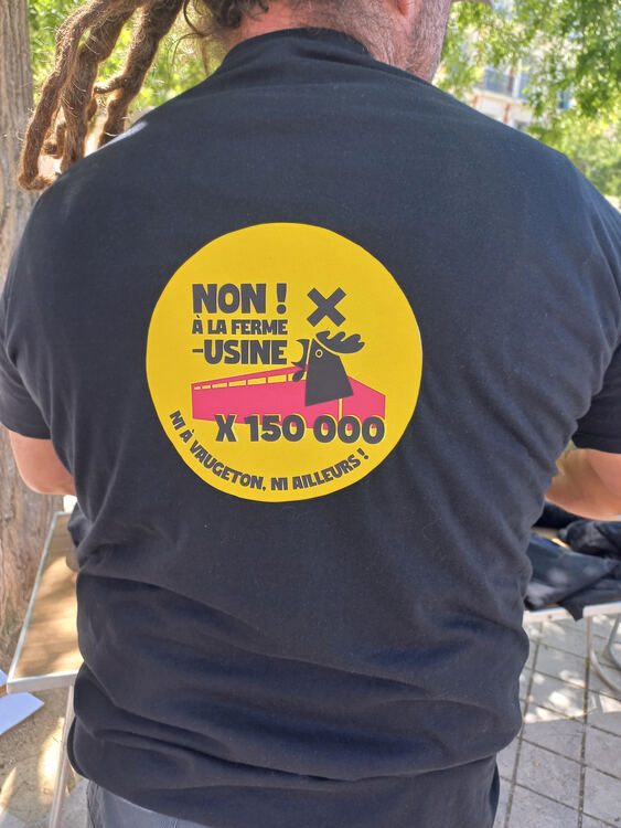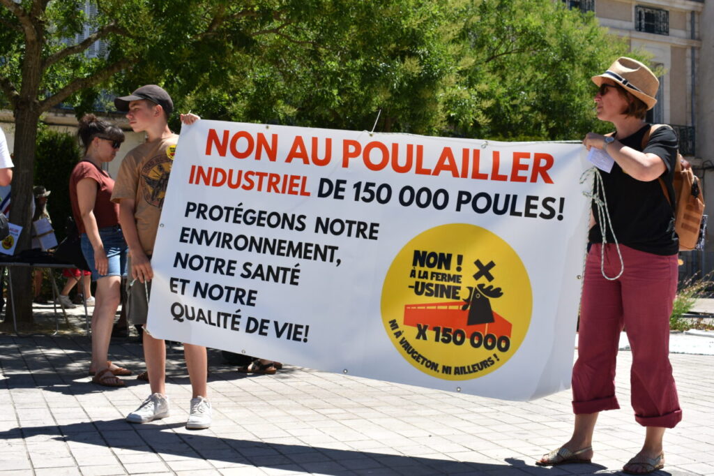 Malgré un soleil de plomb, ce sont plus de 80 personnes qui se sont mobilisées ce samedi 28 juin pour dire « Non à la ferme-usine ! Ni à Vaugeton, ni ailleurs » . Rassemblé⸱e⸱s devant la préfecture de la Vienne, habitant⸱e⸱s, associations, syndicats et politiques, tous⸱tes s’opposent au projet d’installation d’un élevage de 150 000 poules dans une commune de moins de 4 000 citoyen⸱ne⸱s. Nuisances, insécurité routière, bien-être animal… les revendications ne manquent pas.