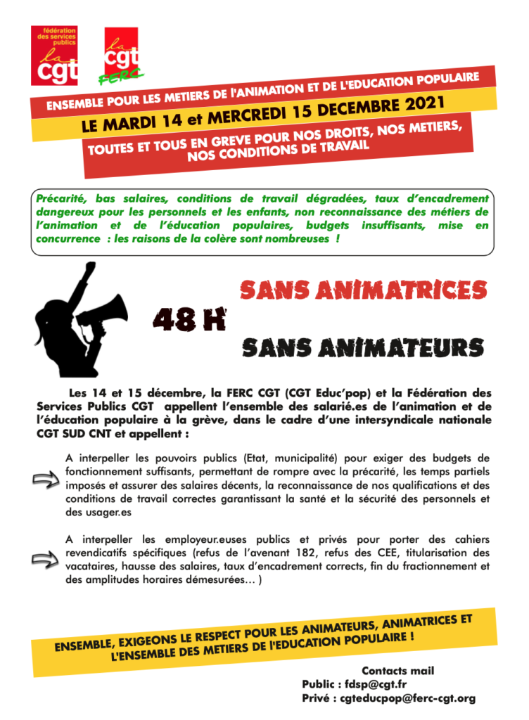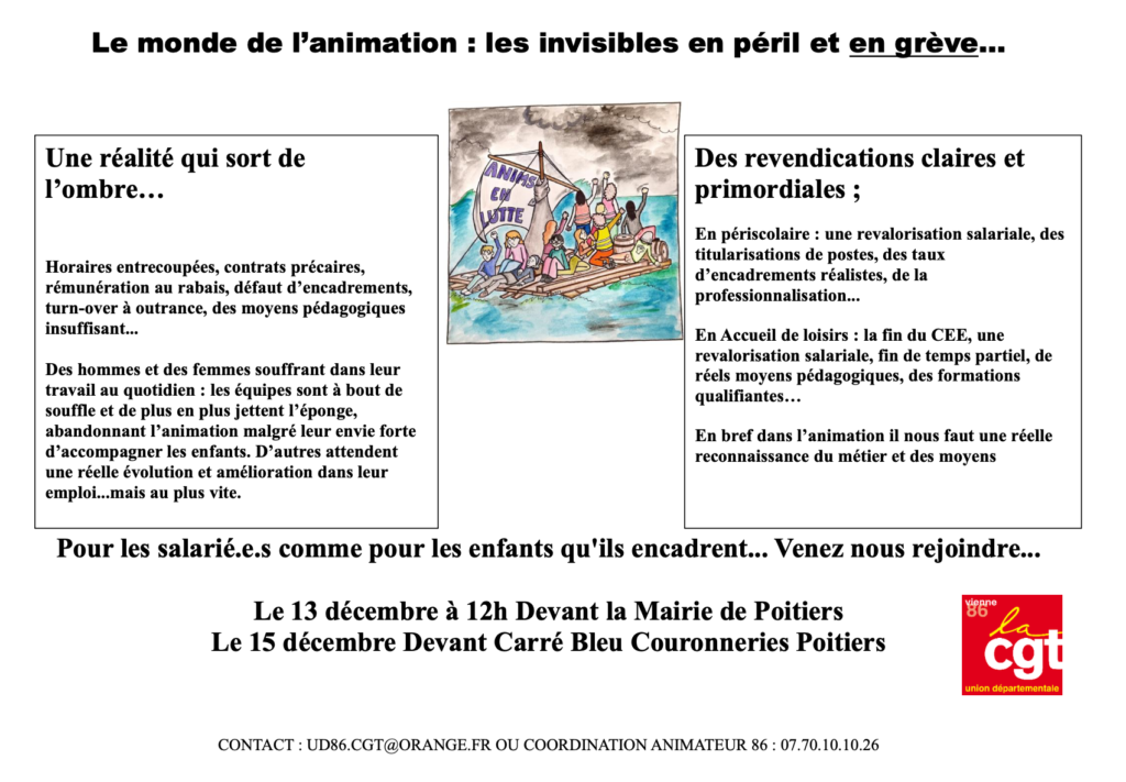 Après la mobilisation du secteur social et médico-social de la semaine dernière, nouvelle mobilisation en vue à l’appel de l’intersyndicale nationale CGT-Solidaires-CNT pour le secteur de l’animation pendant la semaine qui commence : lundi 13, mardi 14 et mercredi 15 décembre, allez soutenir les animateurs et animatrices ! A Poitiers rendez-vous lundi 13 décembre à 14 h devant la mairie de Poitiers, mardi 14 décembre devant la mairie de Châtellerault et mercredi 15 décembre à 12 h devant la salle de Carré Bleu aux Couronneries :