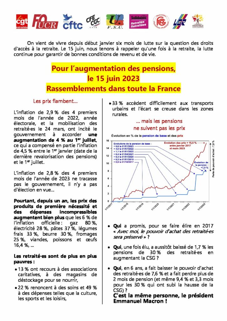 Pour l’augmentation des pensions, le 15 juin 2023, des rassemblements dans toute la France !