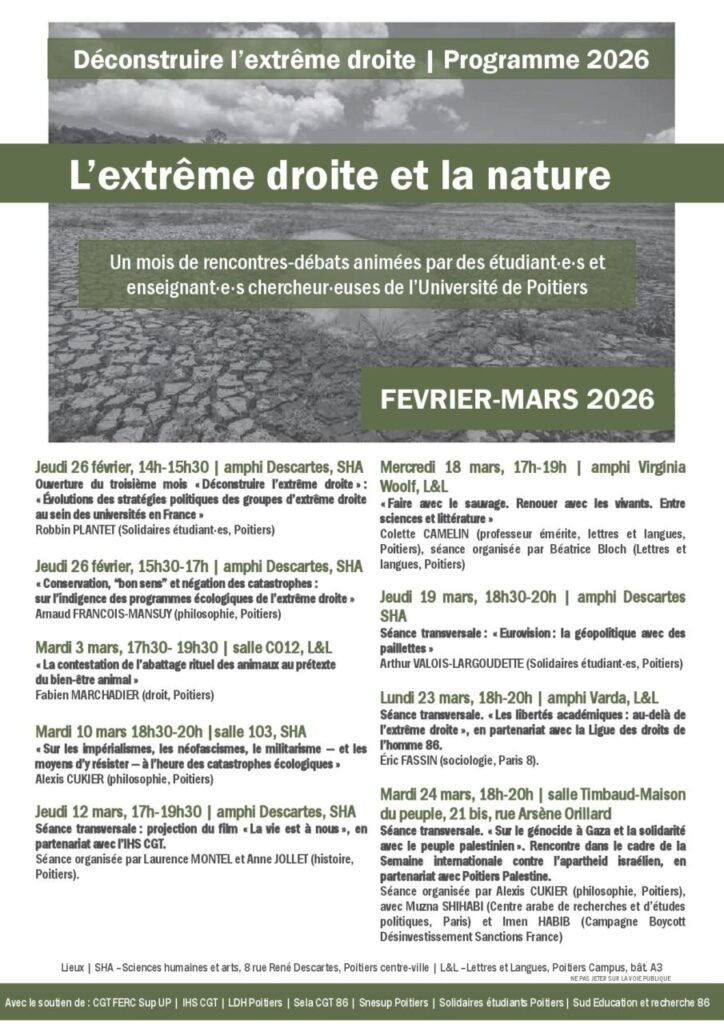 lire Rappel. Déconstruire l’extrême-droite. Le programme 2026 Rédaction 12 mars 2026 Rappel. Déconstruire l’extrême-droite: l’extrême-droite et la nature. Le programme 2026 de conférences à Poitiers. . Partager : Partager sur Facebook(ouvre dans une nouvelle fenêtre) Facebook Envoyer un lien par e-mail à un ami(ouvre dans une nouvelle fenêtre) E-mail Partager sur LinkedIn(ouvre dans une nouvelle fenêtre) LinkedIn Partager sur Telegram(ouvre dans une nouvelle fenêtre) Telegram Partager sur WhatsApp(ouvre dans une nouvelle fenêtre) WhatsApp Partager sur Mastodon(ouvre dans une nouvelle fenêtre) Mastodon Partager sur Bluesky(ouvre dans une nouvelle fenêtre) Bluesky Rédaction Breaking News web86.info victime de son succès Des sous pour Web86 ! [vidéo] Il y a un an, Lisa Belluco était élue. Une longue interview avec la députée NUPES de la Vienne. Les caisses de grève et de solidarité dans la Vienne [vidéo] Clip de campagne NUPES 86 – V. Soumaille Succès de la compagne de financement participatif de web86.info Financement participatif de web86.info. Ça y est ! C’est parti ! [vidéo] Portrait d’un anticolonialiste conséquent [vidéo] À l’autre bout du monde vivent d’autres humains Extrême-droite dans la Vienne… misère, misère… (1) « Rien n’arrête un peuple qui danse ». La Parade des libertés à Poitiers Règles, menstruations, ragnagna Portrait de militant [Vidéo] Interview de Yves Judde qui a rencontré la sociologie et l’étranger Hélène Heintz Shemwell, activiste écologiste : la marge et la politique Rappel. Déconstruire l’extrême-droite. Le programme 2026 Municipales à Poitiers : Un débat décisif sur les enjeux écologiques Municipales 2026 dans la Vienne : Terre de liens se mobilise pour une agriculture locale et nourricière Municipales. Les demandes d’engagement du collectif inter-associatif aux candidat-es 2026 à Poitiers et Châtellerault [Photos] Le 8 mars à Poitiers pour les droits des femmes, on manifeste ! ll était une fois le département de la Vienne, l’AFNOR et la RSO…