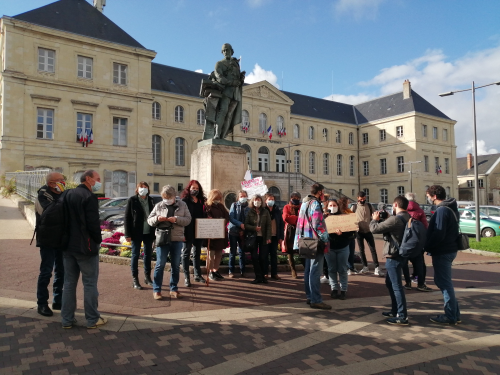 Nous étions 25 devant la mairie à Loudun, des collègues et aussi des soutiens ! Alice, assistante d’éducation, à pointé l’impréparation et l’illusion d’un protocole sanitaire qui n’a de renforcé que le nom. Elle a énuméré les difficultés que rencontrent les assistants d’éducation à exercer leurs missions à la vie scolaire, au self, à l’internat, aux abords de l’établissement.