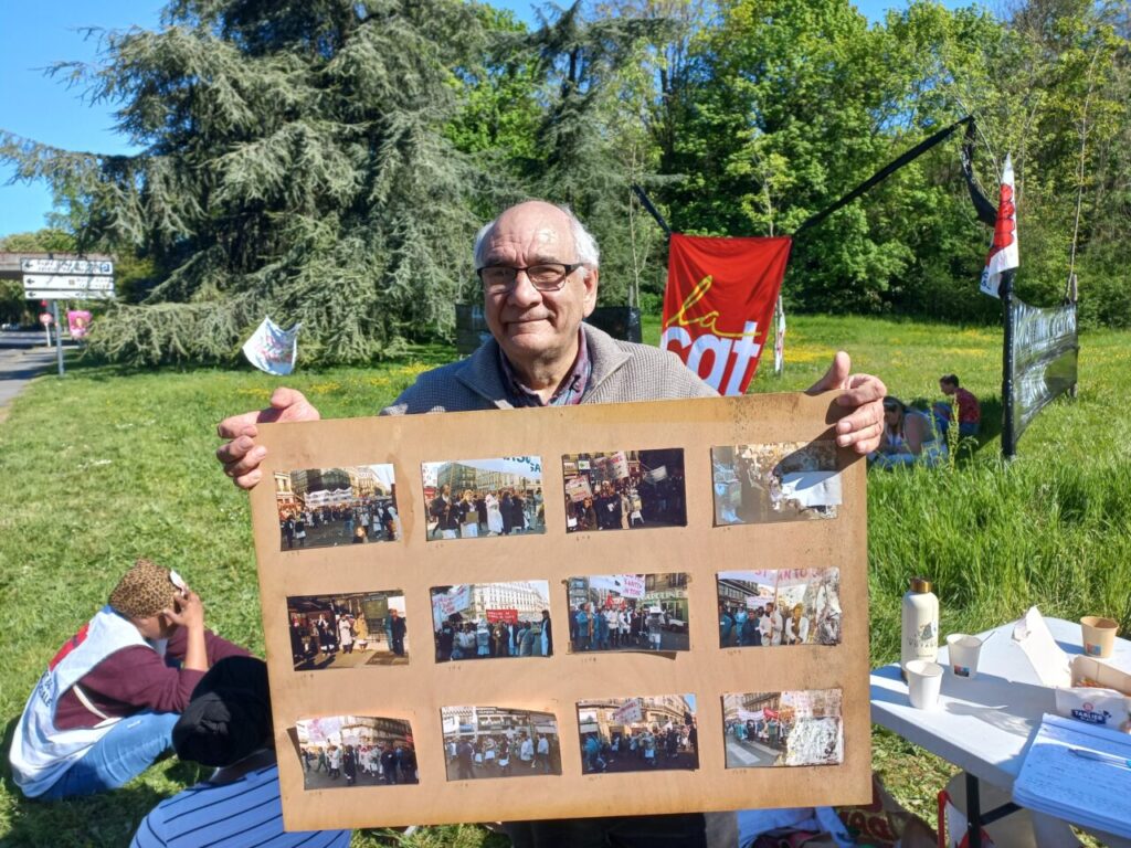 Et parce que cette lutte des classes touche tout le monde il y a aussi des inconnus qui s’arrêtent, questionnent, discutent et… racontent. Un vieux monsieur avance avec une planche sous le bras sur laquelle sont punaisées des photos. La grève générale nationale du personnel de santé publique et privé en 1988 à laquelle il avait participé. Ca duré 1 mois raconte-t-il.