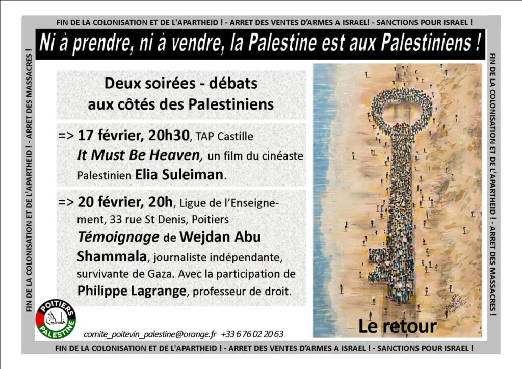 Léonore Moncond’huy, maire de Poitiers et Akram Daoud, professeur de droit à l’université de Naplouse, droit qu’il étudia à Poitiers entre 2001 et 2006 étaient présent.es lors de cette soirée.