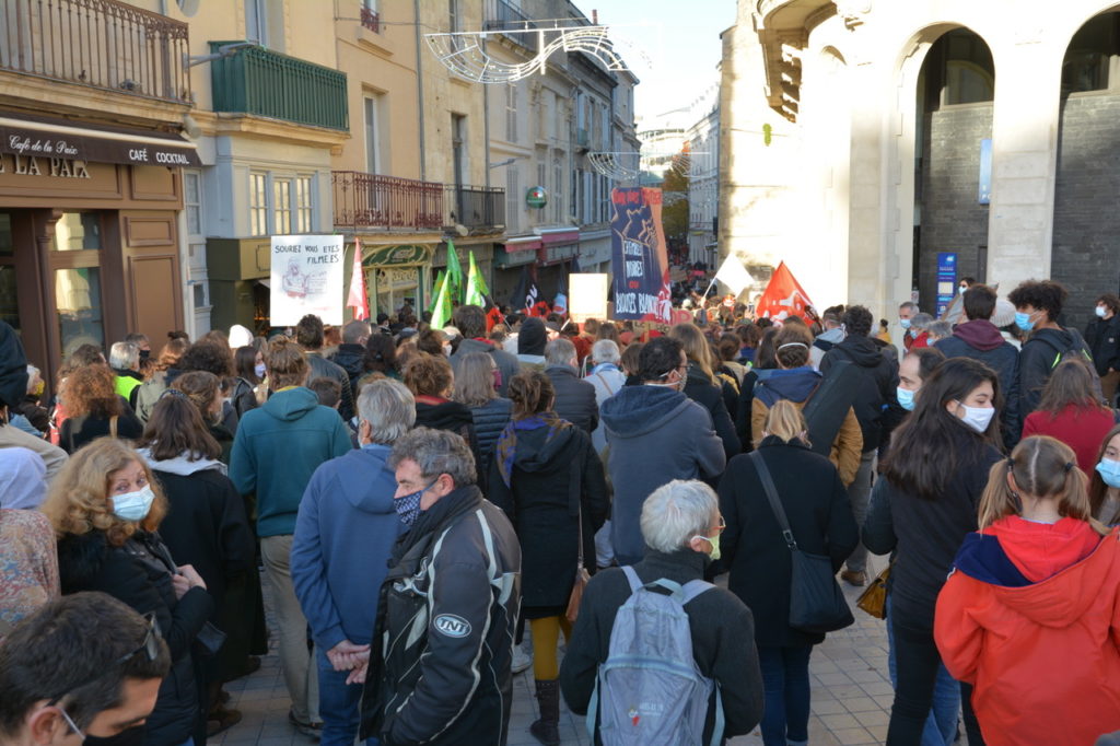 Courte prise de parole de plusieurs mouvements appelant puis manifestation en ville au milieu des badauds… faisant les courses de Noël… et retour sur la place de la mairie. Une partie des manifestant.e.s ont décidé de faire un deuxième tour en ville. L’accès au commissariat était bloqué au niveau de la Poste centrale, rue Pétonnet où le cortège s’est trouvé bloqué : l’atmosphère s’est tendue avec jet de lacrymogènes des forces de l’ordre qui ont dispersé les manifestant.e.s dans les rues piétonnes…