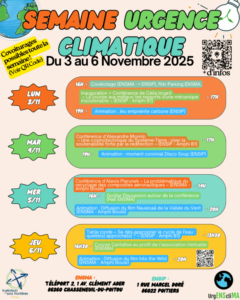 Du 3 au 6 novembre 2025, les élèves-ingénieurs de l’Ecole Nationale Supérieure d’Ingénieurs de Poitiers – ENSI Poitiers et de l’ISAE-ENSMA organisent la 6ème édition de la semaine de l’urgence climatique.