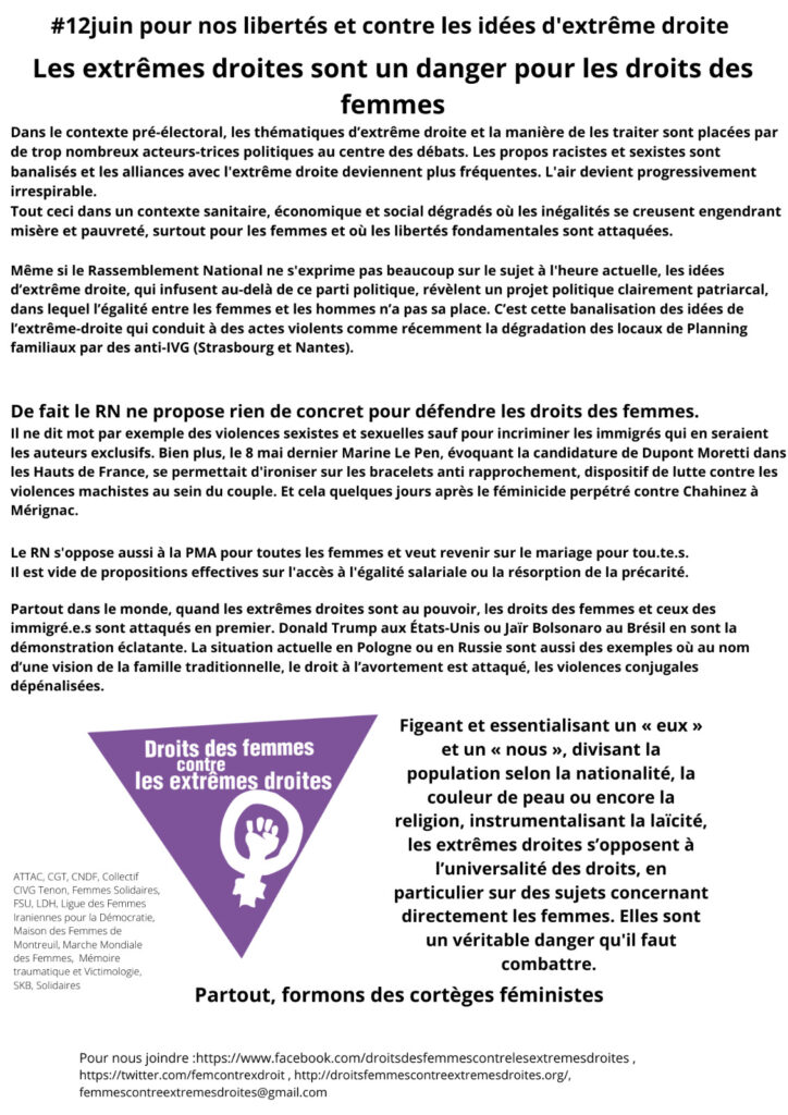 Appel unitaire intersyndical et inter-orgas qui rappelle les dangers de l’extrême-droite contre les droits des femmes et appelle à former des cortèges féministes le 12 juin, lors de la marche des libertés et contre les idées d’extrême-droite