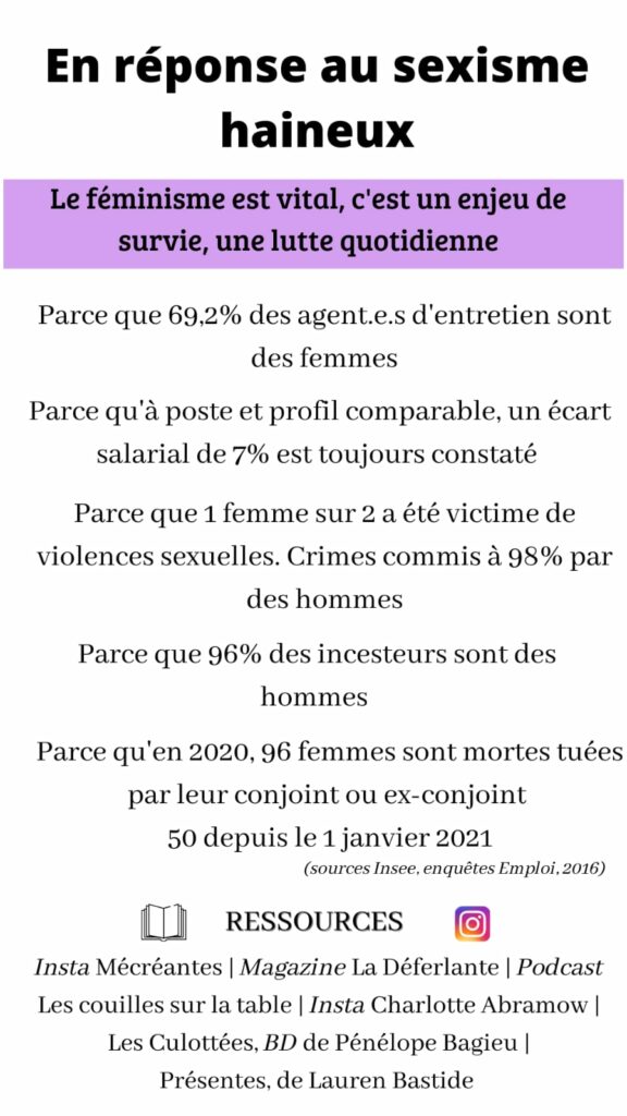 Nous rappelons que le féminisme lutte contre les violences masculines faites aux femmes mais également contre l’ensemble des formes de discriminations des oppresseurs et pour une société apaisée.