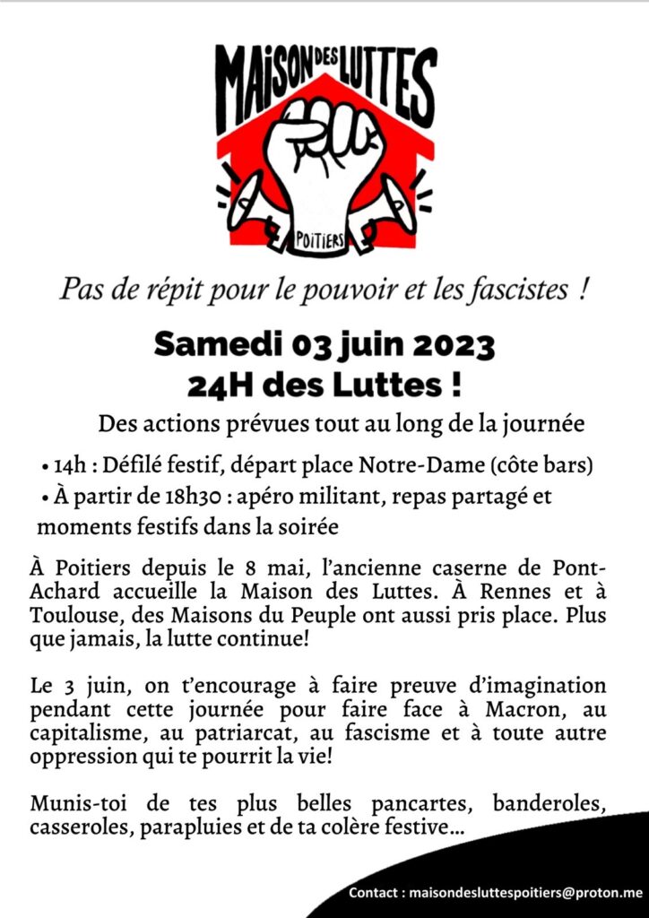 Le 2 juin prochain, à la Maison du Peuple de Poitiers, vous êtes conviés.es à une soirée de rencontres entre et avec des syndicalistes, des paysans.nes, des jeunes révolté.es, des habitants.es en lutte, … toutes et tous engagés.es dans des combats sociaux et des soulèvements de la terre pour défendre les communs et le droit de vivre dignement